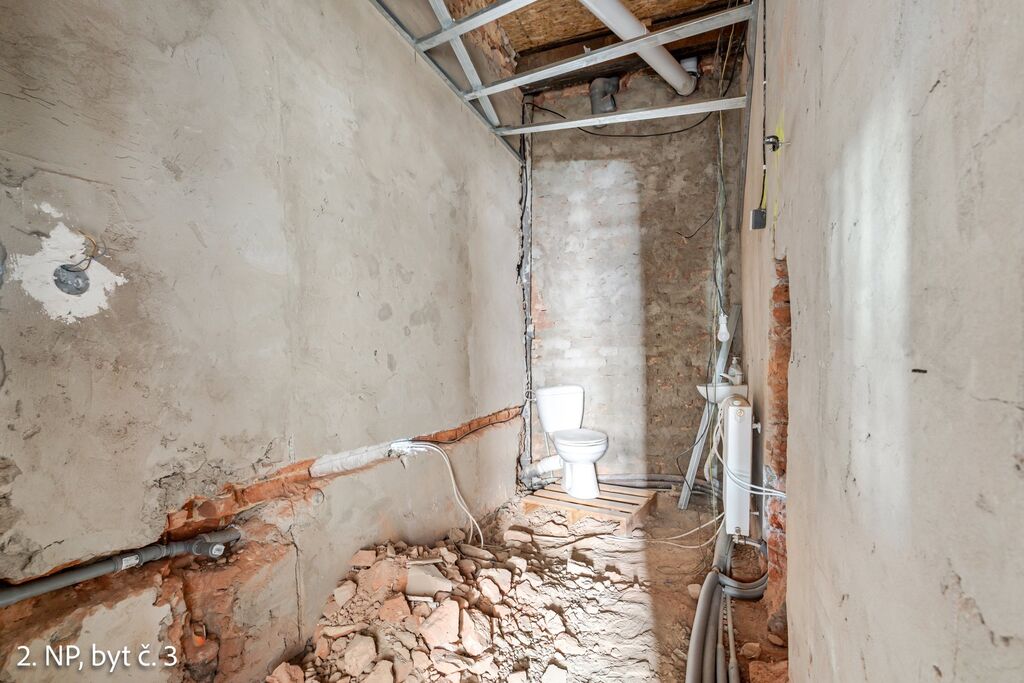 V 1. patře jsou byty zhruba z 50 % hotové, s dokončenými rozvody a částí stavebních úprav.