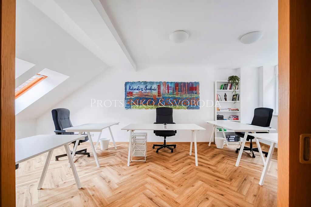 Kancelář se nachází v posledním patře historické budovy s výtahem a má velmi praktické rozložení: předsíň (7,1 m²), komora (2,7 m²), WC (2,6 m²), koupelna (5,1 m²), kuchyň (9,1 m²), hlavní kancelář (26,6 m² ), druhá kancelář (28,4 m²)