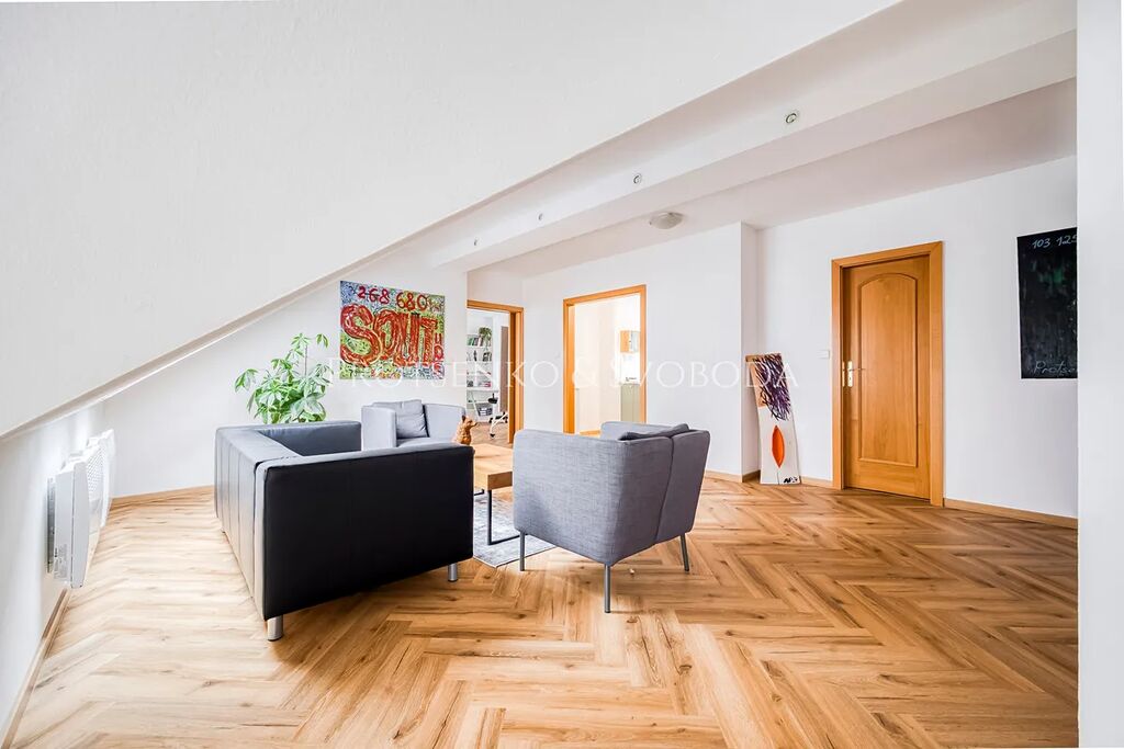 Kancelář se nachází v noblesní secesní budově s bohatě zdobenou fasádou, která je sama o sobě symbolem historie a prestiže centra Prahy. Dům prošel citlivou rekonstrukcí, při níž byl zachován původní architektonický ráz, ale doplněn o moderní prvky pro pohodlí nájemců. Celý prostor působí velmi elegantně a reprezentativně – díky kombinaci dřevěných podlah, kvalitních materiálů a světlého mezonetového řešení s výhledem na střechy historického centra Prahy.