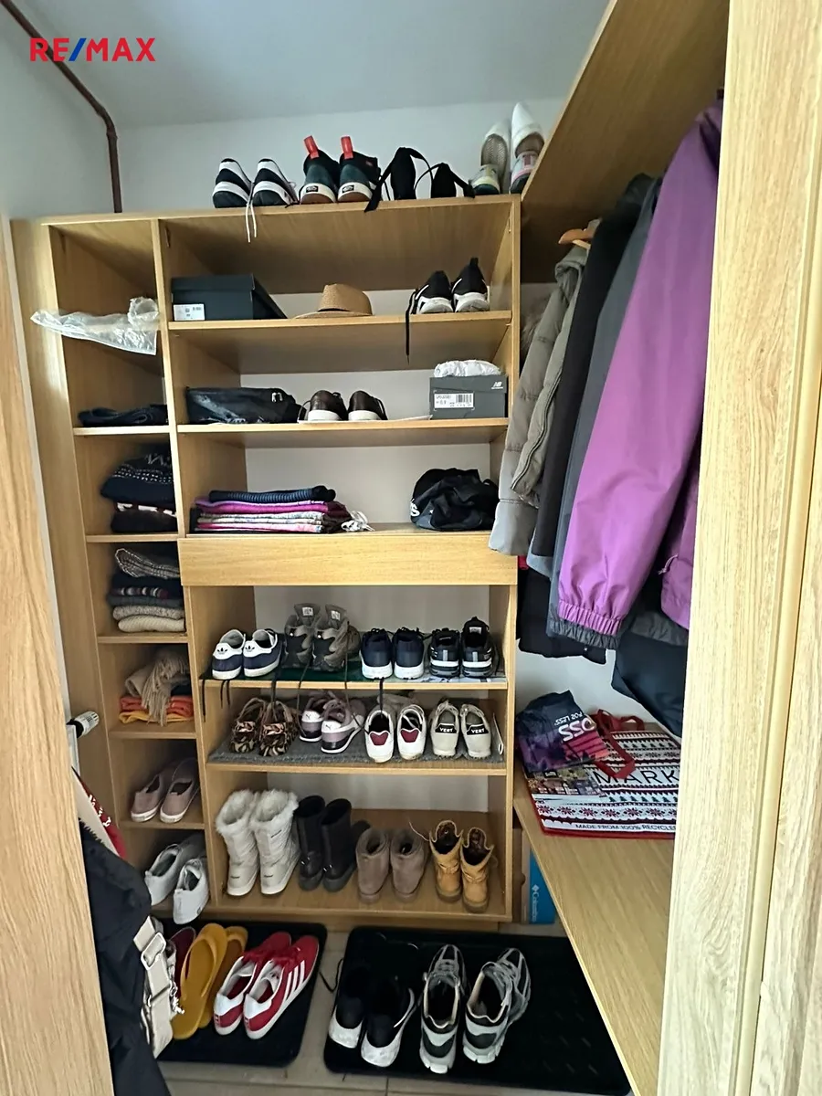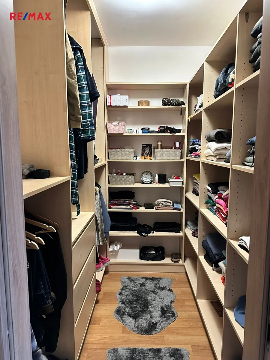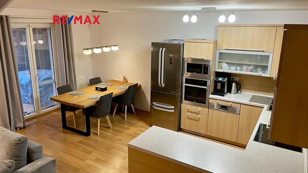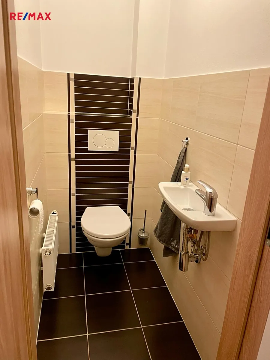 V přízemí domu se nachází prostorný obývací pokoj s kuchyňským koutem a moderní kuchyňskou linkou s  vestavěnými spotřebiči, dále toaleta s umyvadlem, šatna, prádelna a garáž pro jeden osobní automobil. V patře jsou k dispozici čtyři pokoje, šatna a koupelna s vanou a toaletou. Šatna v přízemí a šatna v patře jsou vybaveny vestavěnými skříněmi, stejně jako dva pokoje v patře. Jeden z pokojů v patře lze využívat také jako pracovnu, je zde k dispozici knihovna. V obývacím pokoji  je rozkládací sedací souprava a nábytková obývací stěna (jídelní stůl a židle v obývacím pokoji uvedené na fotografii nejsou aktuálně k dispozici, nicméně stávající nájemce může nabídnout prakticky nový další nábytek - jídelní stůl, postele v pokojích, atd.). Majitel domu neuvažuje o demontáži stávajícího vestavěného nábytku na míru.