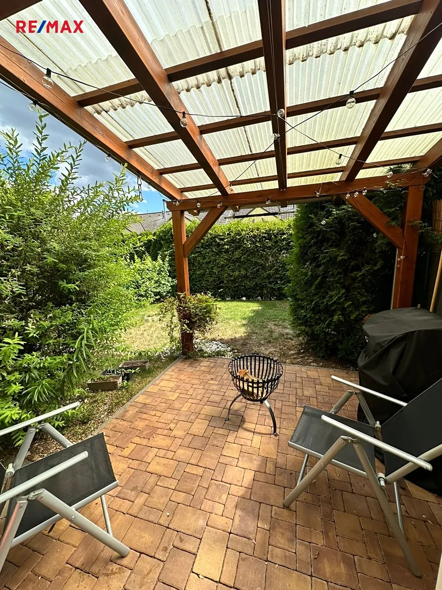 Udržovaná zahrada s terasou a pergolou nabízí místo k odpočinku.