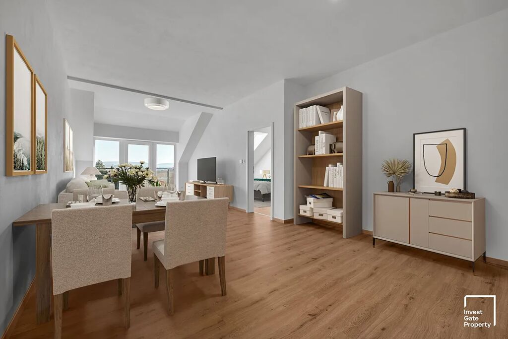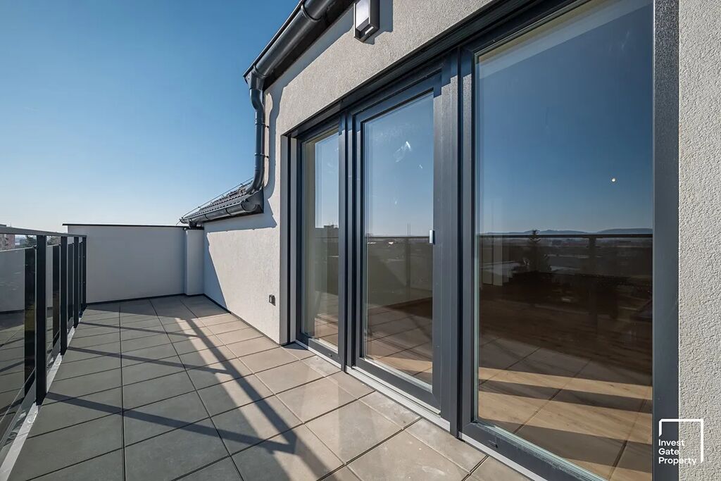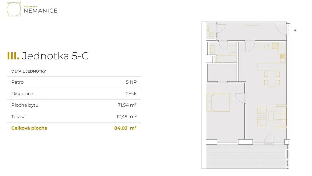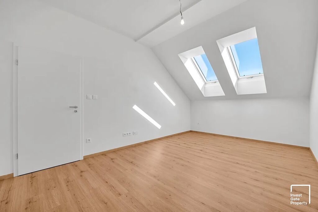 Dispozice bytu je 2+kk a jeho celková plocha činí 84m2 (podlahová plocha bytu činí 72m2 a terasa má výměru 12m2). Byt se nachází ve 5. nadzemním podlaží domu – jedná se o podkrovní byt a ložnice se střešními okny má skutečně nezaměnitelnou atmosféru.