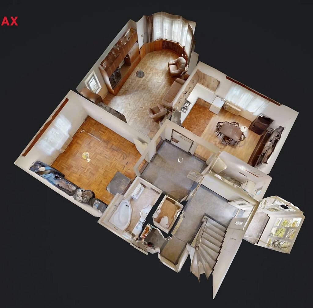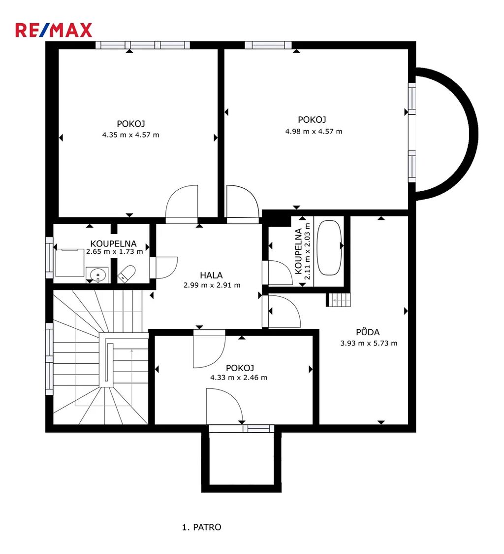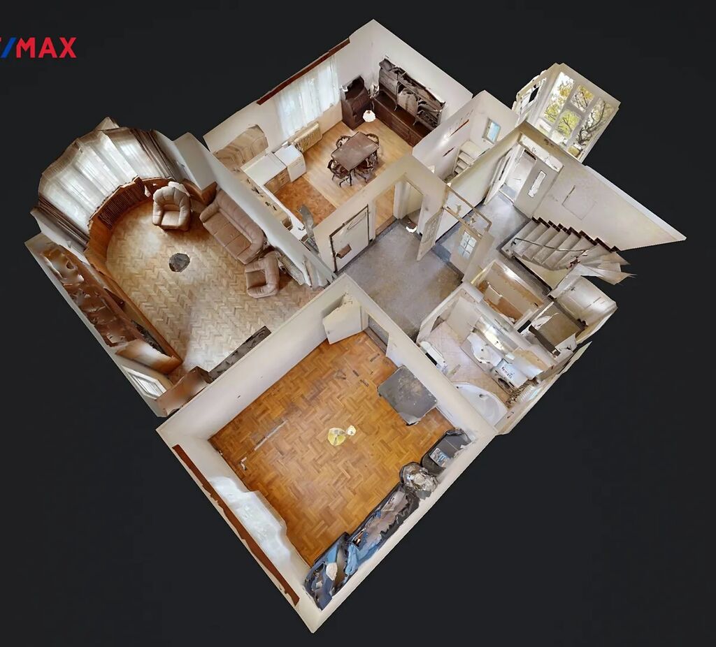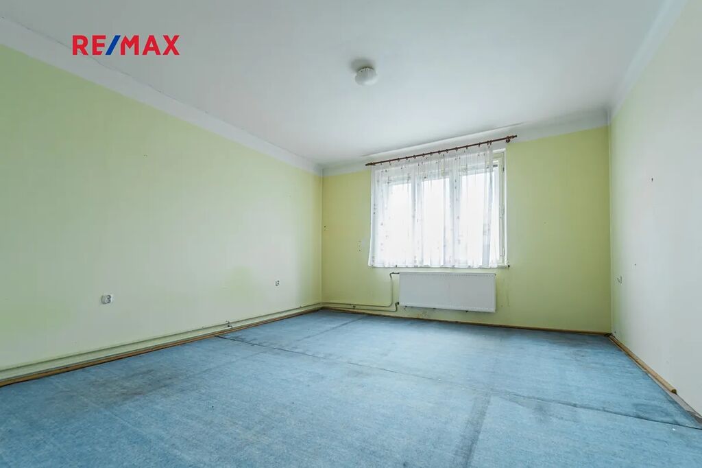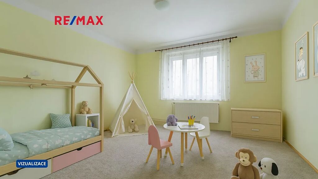 •	1. NP 117 m²: vstupní hala se schodištěm, kuchyně, obývací pokoj s novějším oknem, další pokoj, koupelna s WC, vstup do sklepa a podkroví