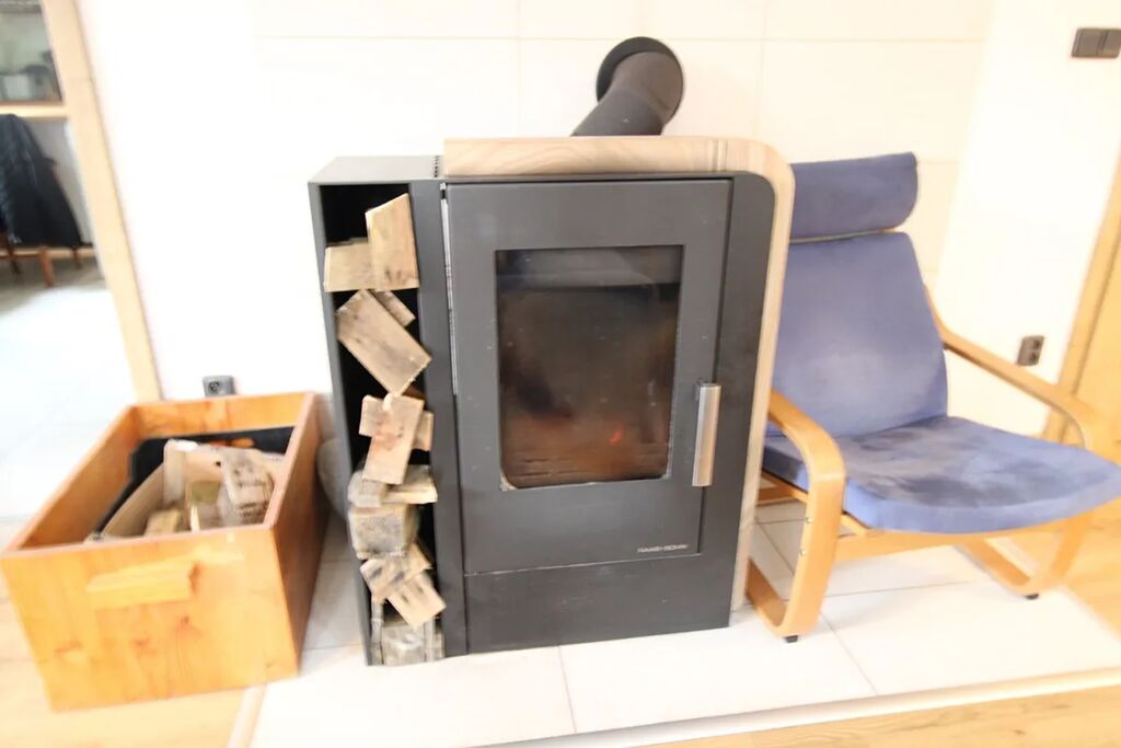 O vytápění se stará tepelné čerpadlo (elektrické) v kombinaci s krbovými kamny v obývacím pokoji, což zajišťuje příjemné teplo i v chladnějších dnech a nízké provozní náklady.