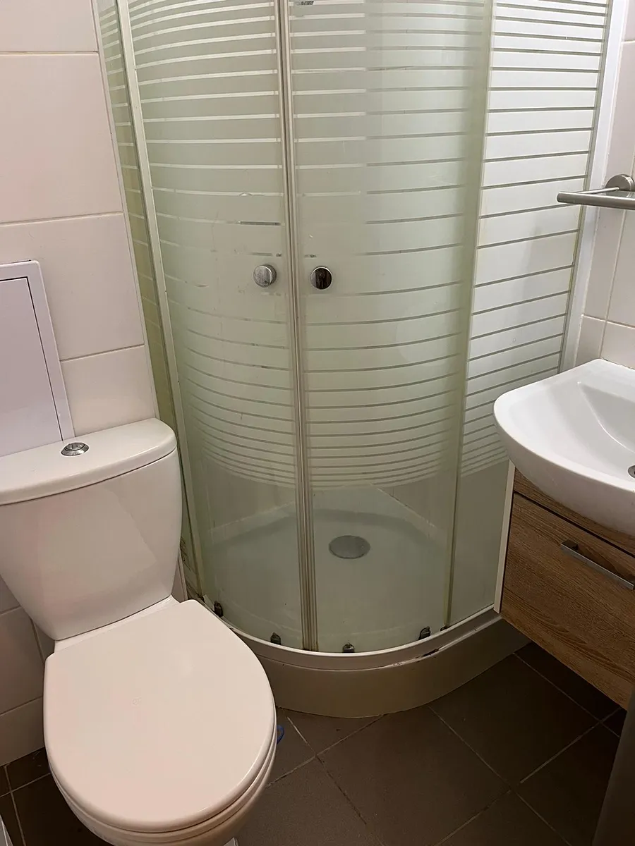 Kuchyňská linka, koupelna se sprchovým koutem a WC.