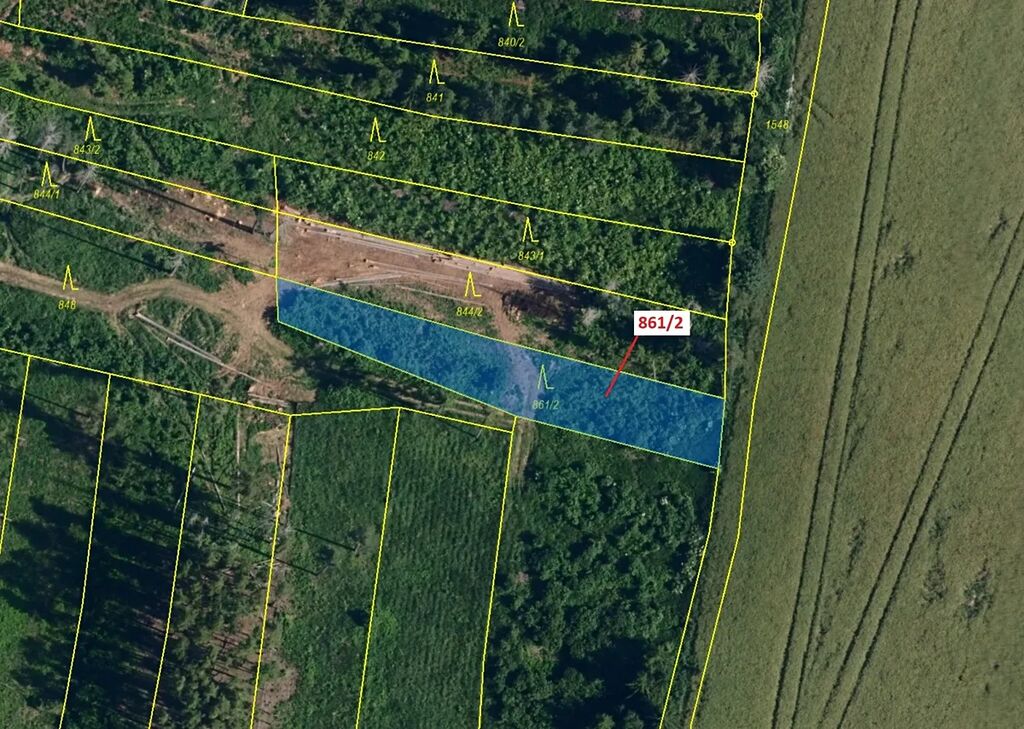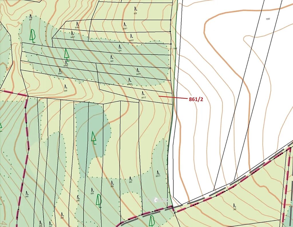 Lesní pozemek o výměře 834 m2, parcelní číslo 861/2, podíl 1/1, katastrální území Vranín, obec Moravské Budějovice, obec s rozšířenou působností Moravské Budějovice, okres Třebíč, Kraj Vysočina. Po těžbě.