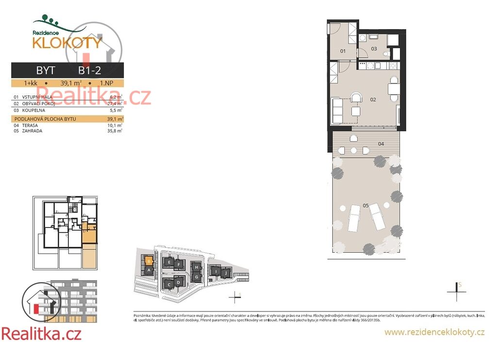 V exkluzivním projektu Rezidence Klokoty nabízíme byt B1-2, nacházejícím se v 1. NP o dispozici 1+kk o výměře 39,1 m2 , terasou 10,1 m2 a zahradou 35,8 m2. Byt je tvořen vstupní halou, obývacím pokojem a koupelnou s WC.