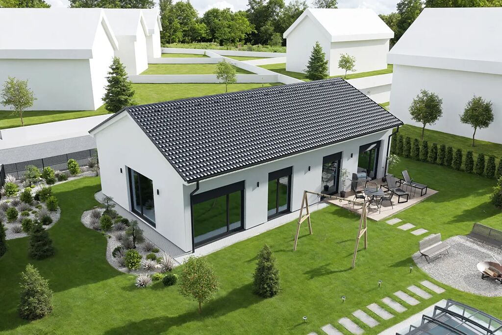 Vnitřní uspořádání splní očekávání i náročných zákazníků hledajících pěkné, moderní bydlení s dostatkem prostoru. Dům o užitné ploše 94,3 m² nabízí velkorysý obývací pokoj s kuchyňským koutem a třemi východy na terasu. Vchod na terasu je zajištěn bezprahovým hliníkovým HS portálem o šířce 3 metry. Dále pak 3 pokoje s možností vstupu na zahradu. Praktické řešení doplňuje technická místnost. V domě dále naleznete prostornou koupelnu s nadstandardním vybavením a samostatnou toaletu.