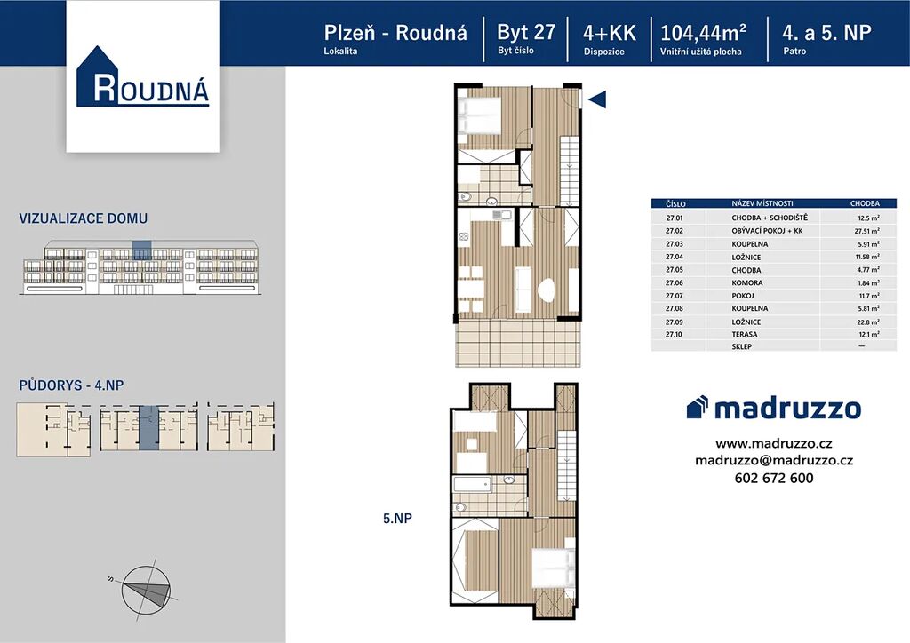 Nabízíme Vám prakticky řešený mezonetový byt č. 27 o dispozici 4+kk a velikosti 104,6 m2 s prostornou terasou o velikosti 12,1 m2 umístěný ve 4.a 5. NP. Byt je vhodný nejen pro rodiny, ale určitě zaujme také páry, které mají rády prostorné bydlení.