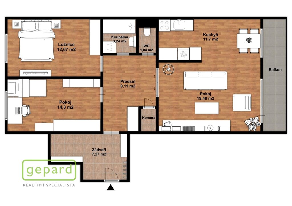 Z prostorné předsíně je přístup do dvou samostatných ložnic (14,3 m² a 12,7 m²), koupelny s vanou a elektrickým podlahovým topením , odděleného WC a praktické komory, která společně se zádveřím, poskytují dostatek úložného prostoru.