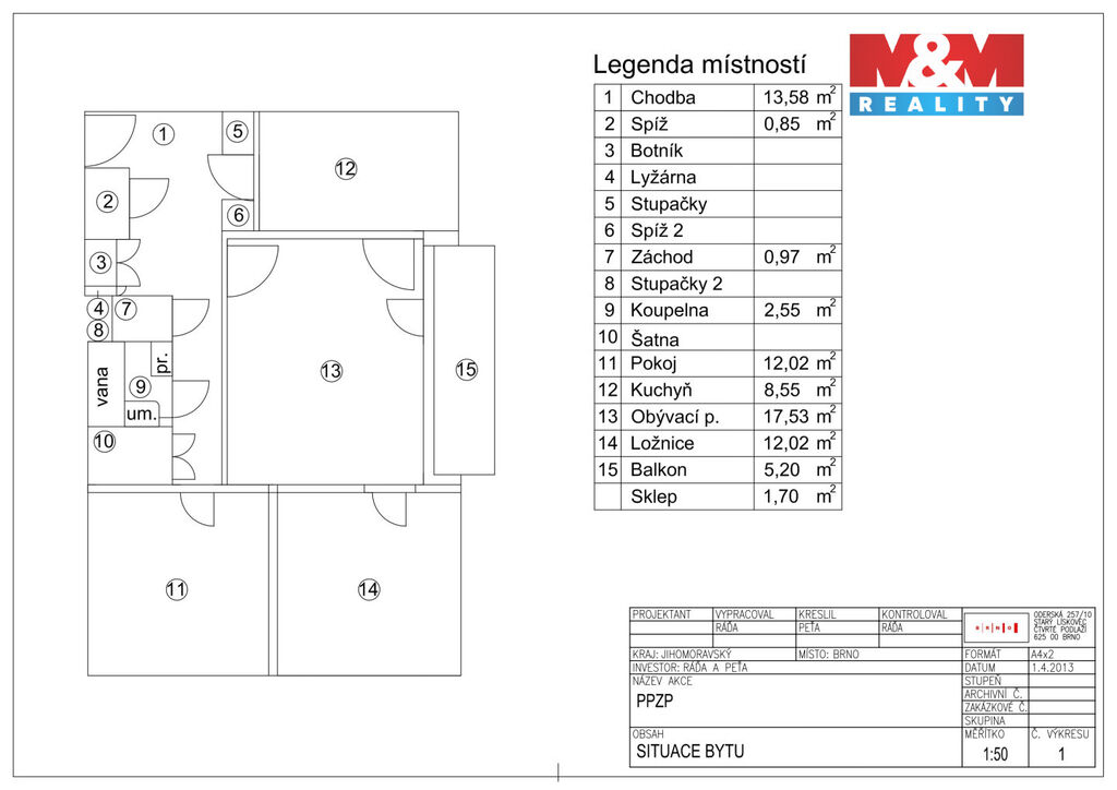 Nabízíme k prodeji družstevní byt 3+1 o velikosti 68,1 m² s balkonem 5,2 m2 a sklepem 1,7 m2 v klidné části Starého Lískovce. Nelze převést do OV, anuita je již splacena.