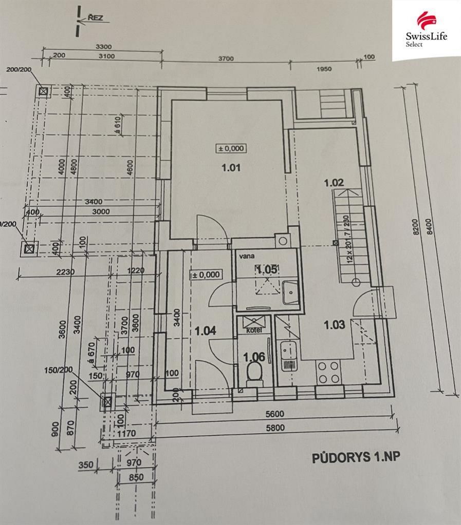 Přízemí - vstupní chodba s vestavěnými skříněmi, obývací pokoj, kuchyň, koupelna, WC, dřevěné schodiště