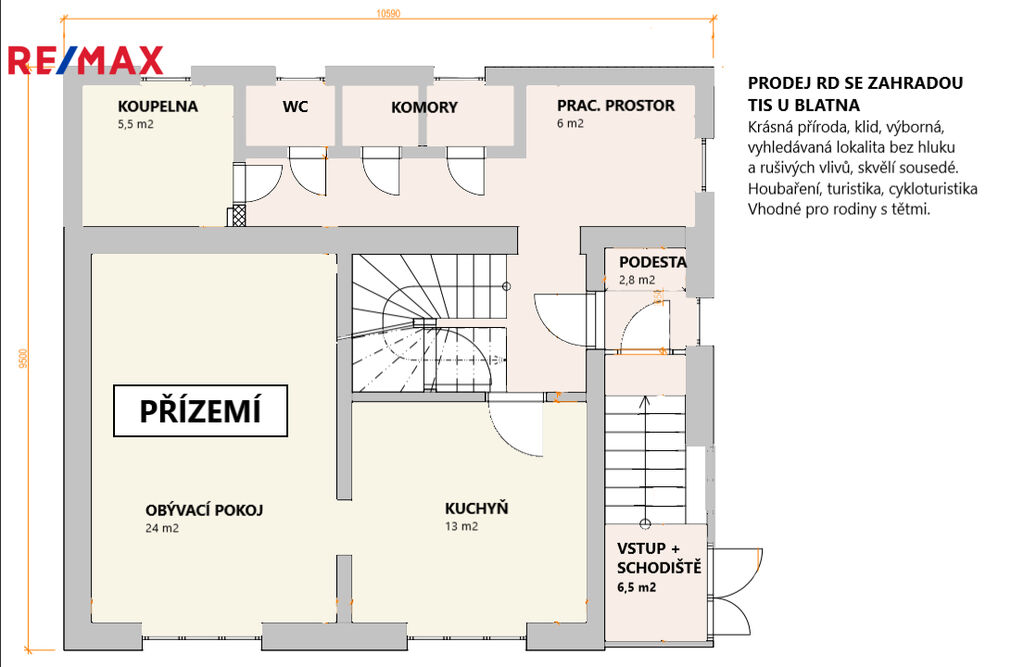 Detailnější náhled dispozic domu spolu s rozměry a rozmístění staveb na pozemku naleznete na přiloženém půdorysu.