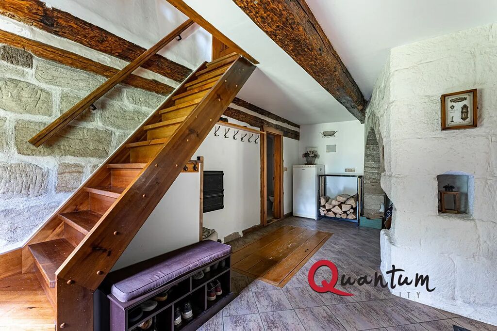 Interiér zachovává původní charakter roubenky – dřevěné trámy, masivní podlahy a kachlová kamna – a zároveň splňuje současné nároky na komfortní bydlení.