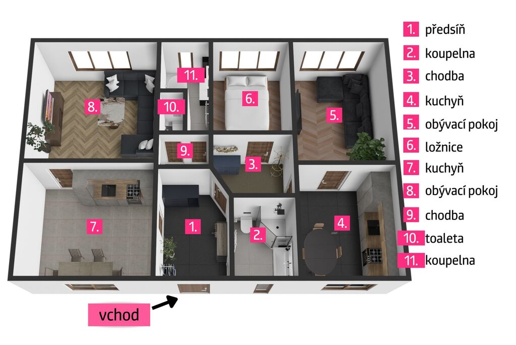 Celková podlahová plocha činí 81 m² a dispozice domu umožňuje flexibilní využití prostoru, včetně možnosti rozdělení na dvě samostatné bytové jednotky – 1+1 a 2+1. Dům disponuje dvěma kuchyněmi a dvěma koupelnami, což zajišťuje pohodlné vícegenerační bydlení, umožňuje krátkodobé pronájmy nebo kombinaci vlastního bydlení s výnosem z pronájmu.