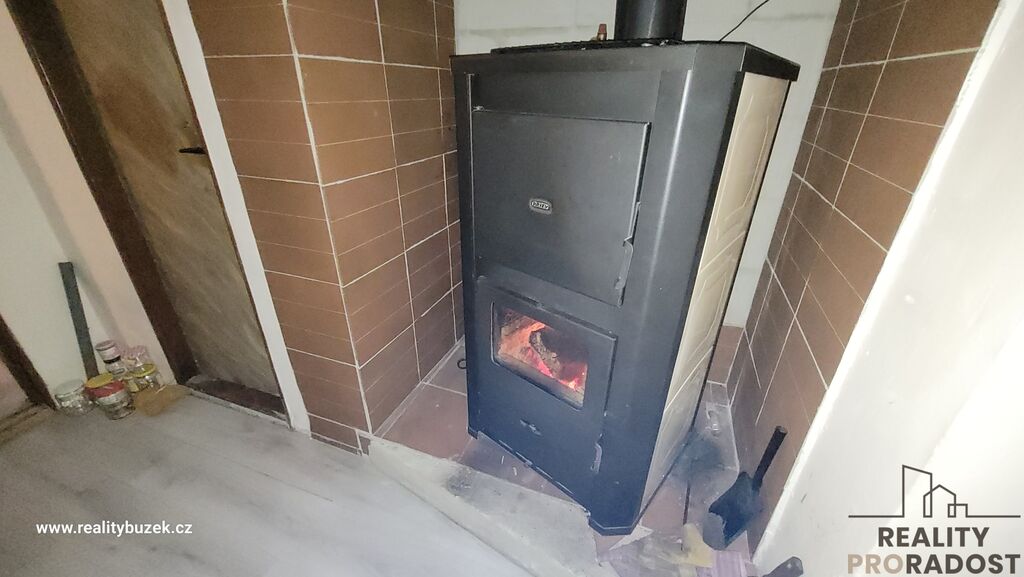 Vytápění je řešeno krbovými kamny, které dodávají interiéru příjemnou atmosféru a tepelný komfort.