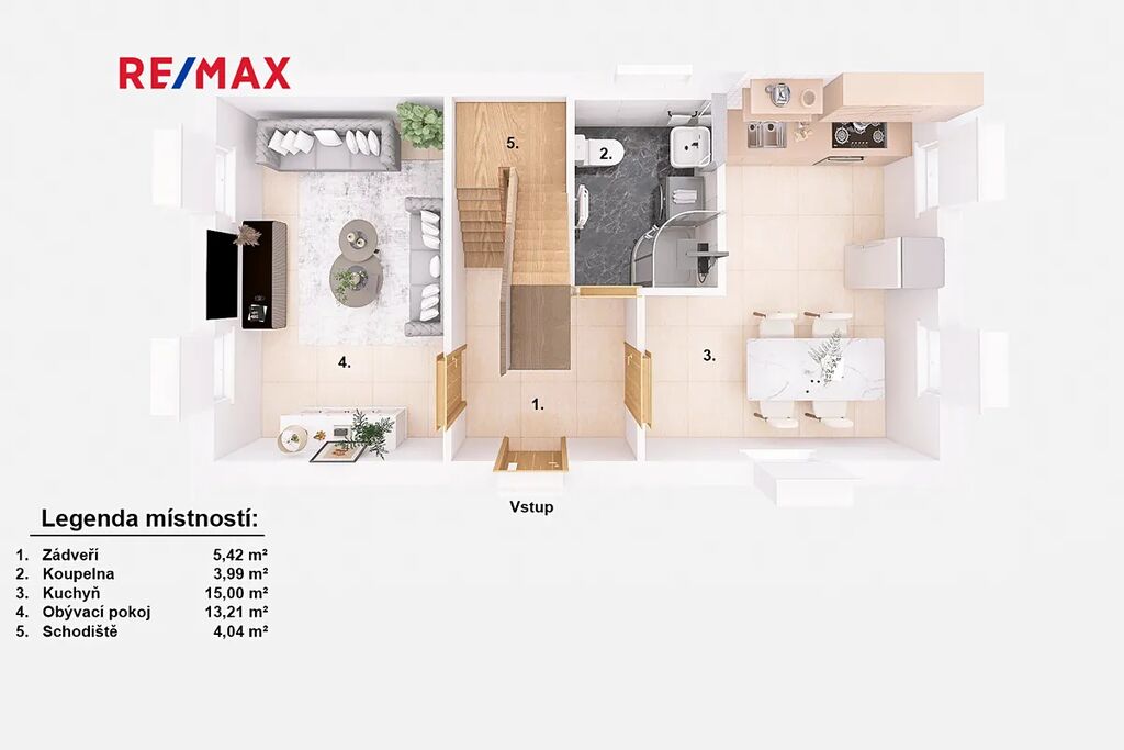 V přízemí na Vás čeká útulná kuchyně s krbovými kamny s výměníkem, které v zimě vykouzlí domovskou atmosféru i teplo poctivého ohně. Dále tu najdete koupelnu, obývací pokoj a praktický prostor pod schody ideální pro uložení věcí, které chcete mít po ruce. Z obývacího pokoje vede cesta do patra se dvěma samostatnými ložnicemi – klidnými, příjemnými a s vůní dřeva, která ke stylu chaty jednoduše patří.
