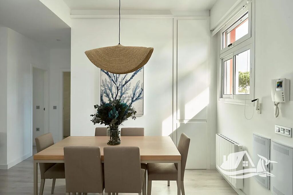 Denní část tvoří světlý obývací pokoj s jídelnou a moderní kuchyní vybavenou kvalitními spotřebiči. Tři ložnice zajišťují dostatek soukromí a dvě elegantně zařízené koupelny přinášejí komfort každodenního života.