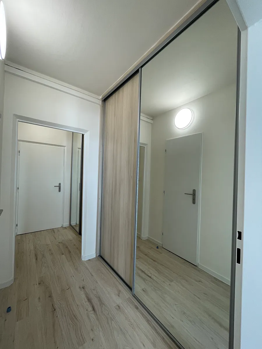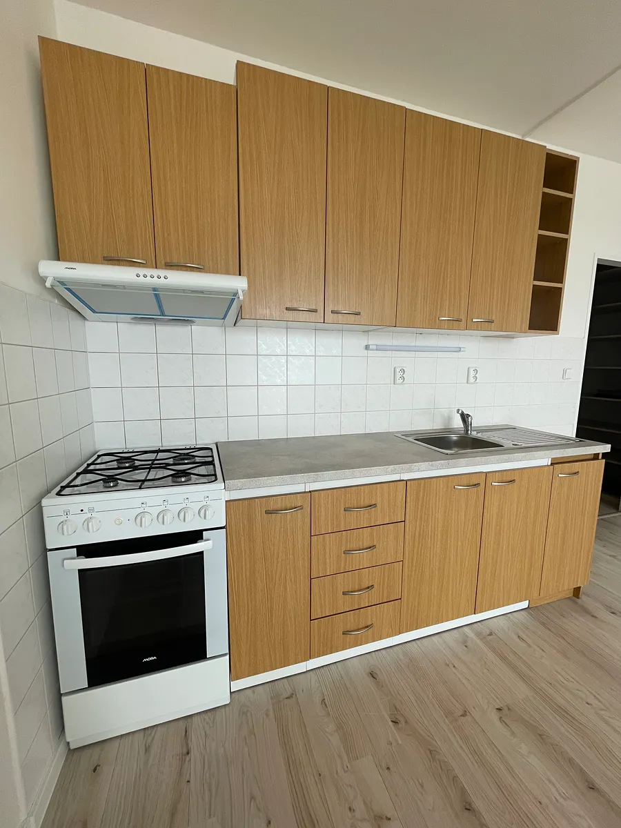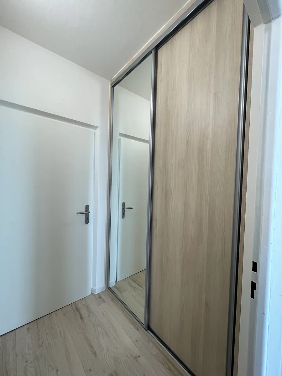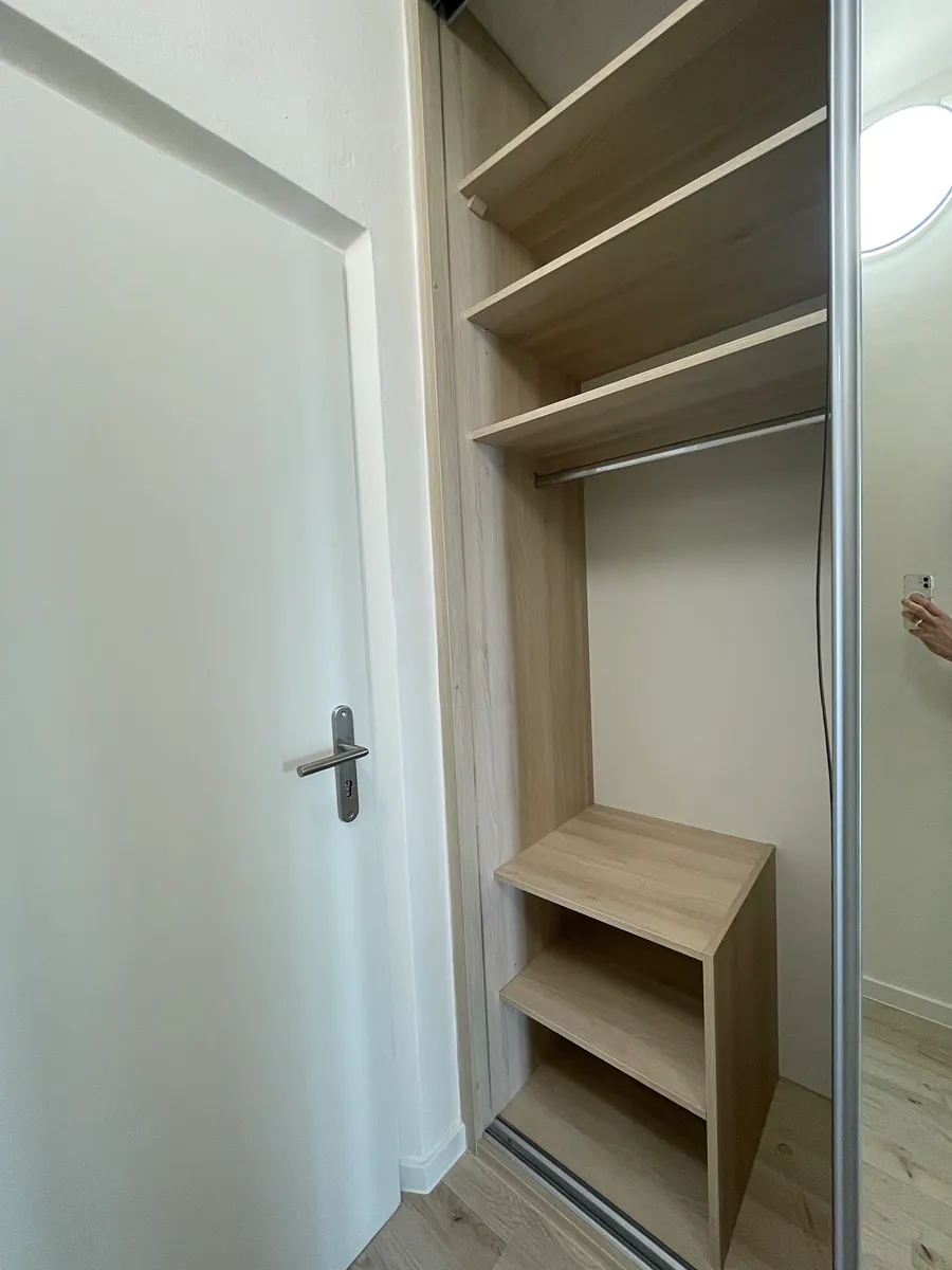 Byt disponuje plně vybavenou kuchyní se spotřebiči, koupelnou s pračkou a vestavěnými skříněmi v předsíni, které poskytují dostatek úložného prostoru. Díky vysokému patru je byt velmi světlý a nabízí příjemný výhled.