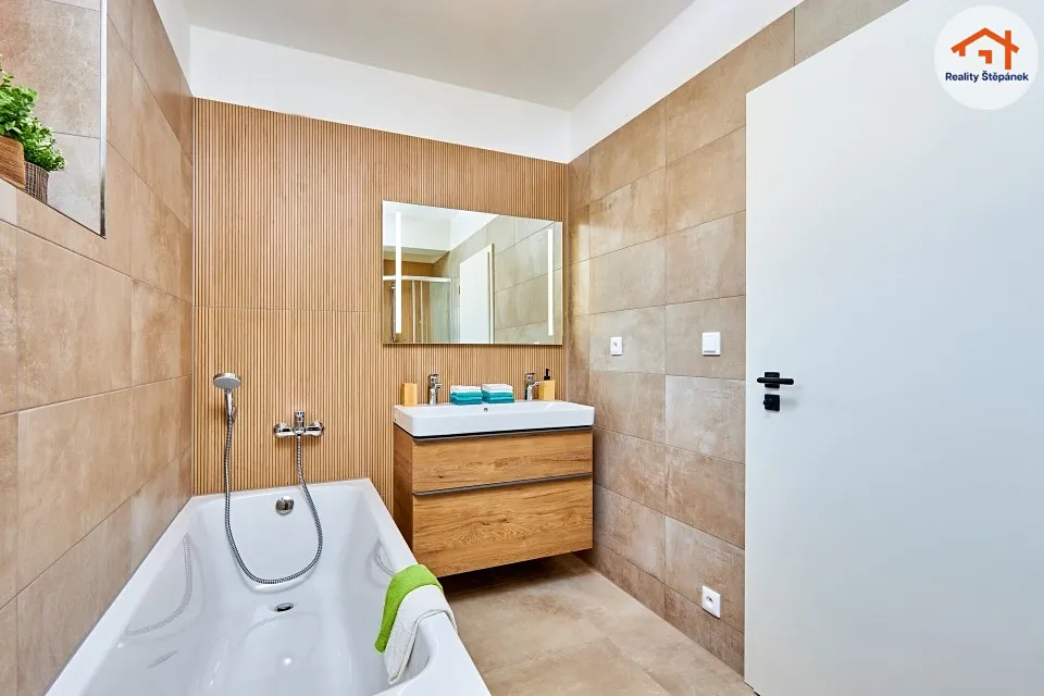 Dům tvořený jedním nadzemním podlažím nabízí obytnou plochu 115 m² s prostorným obývacím pokojem se zvýšenými stropy a odhalenými trámy, třemi ložnicemi, pracovnou, předsíní, prádelnou, technickou místností a chodbou. Z obývacího pokoje je možné vyjít na zastřešenou terasu o ploše 16,55 m² s přímým vstupem do zahrady. Dům se může dále pyšnit lepenými vinylovými podlahami, kvalitní koupelnou s broušeným obklady, nebo saunou na míru.