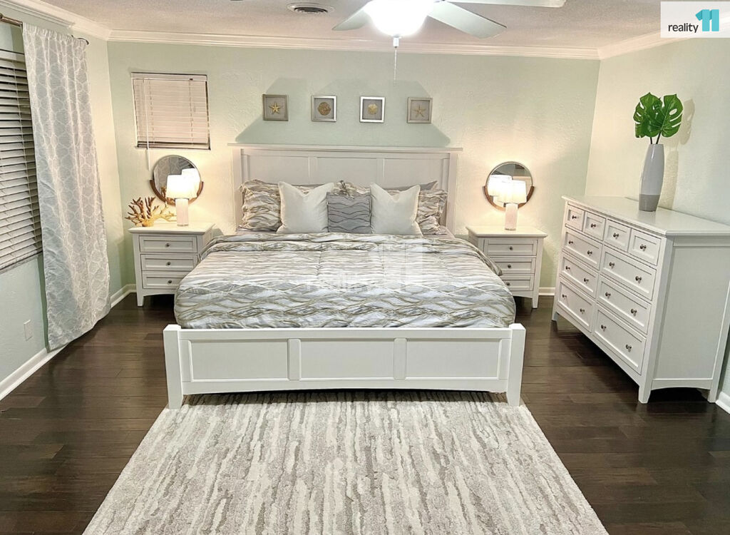 • Prostorná hlavní ložnice s výhledem do zelené zahrady a živým bambusovým plotem, který zajišťuje soukromí