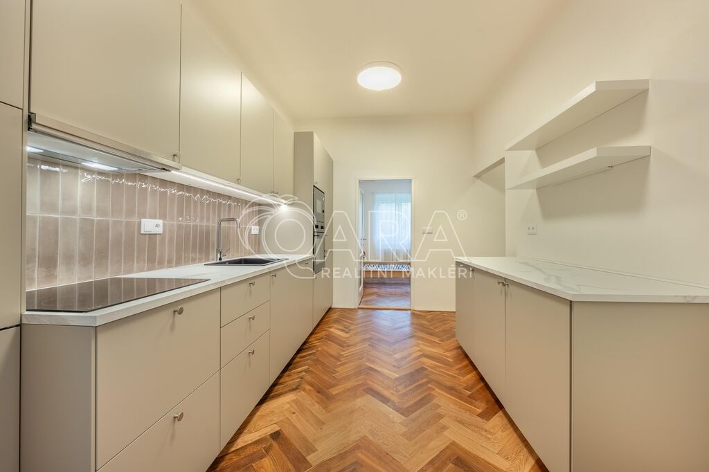 Interiér prošel kompletní renovací – majitel si dal záležet na detailech. Na podlahách jsou krásné parkety, nová kuchyňská linka nabízí plno úložného prostoru, koupelna s vanou je designově sladěná a WC je oddělené. Obě ložnice jsou orientované do vnitrobloku (jedna má balkon, druhá velkou vestavěnou skříň), obývací pokoj je směrem do ulice.