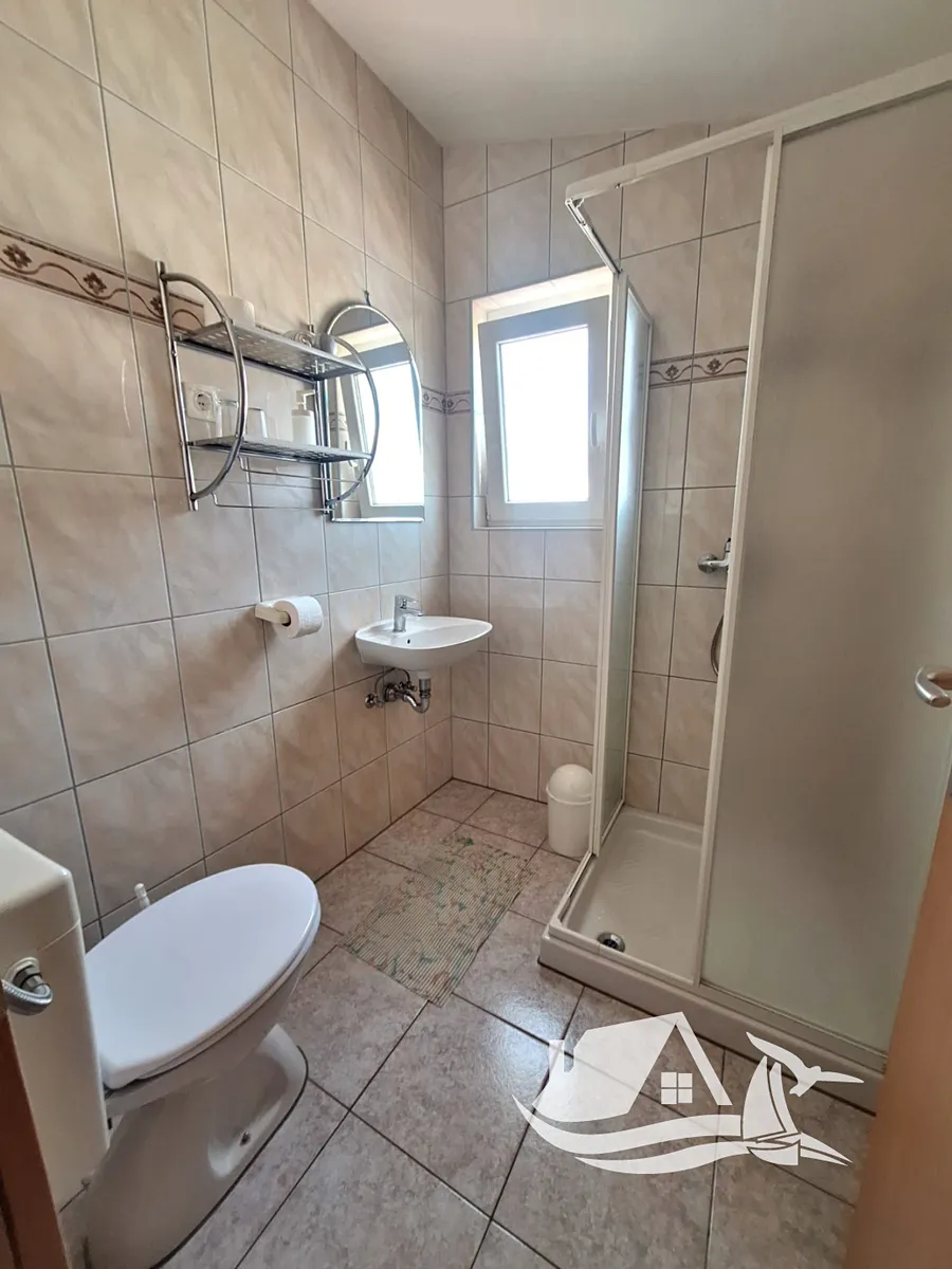 Apartmán má celkovou hrubou plochu 32 m² a čistou užitnou plochu 25 m². Dispozice zahrnuje obývací pokoj s kuchyní a spací částí, koupelnu a příjemnou krytou terasu, která rozšiřuje obytný prostor a nabízí místo pro relaxaci po dni stráveném u moře. K apartmánu náleží jedno vyhrazené parkovací místo a navíc i podíl na společném prostoru se zahradním grilem, kde můžete trávit čas s přáteli a rodinou.