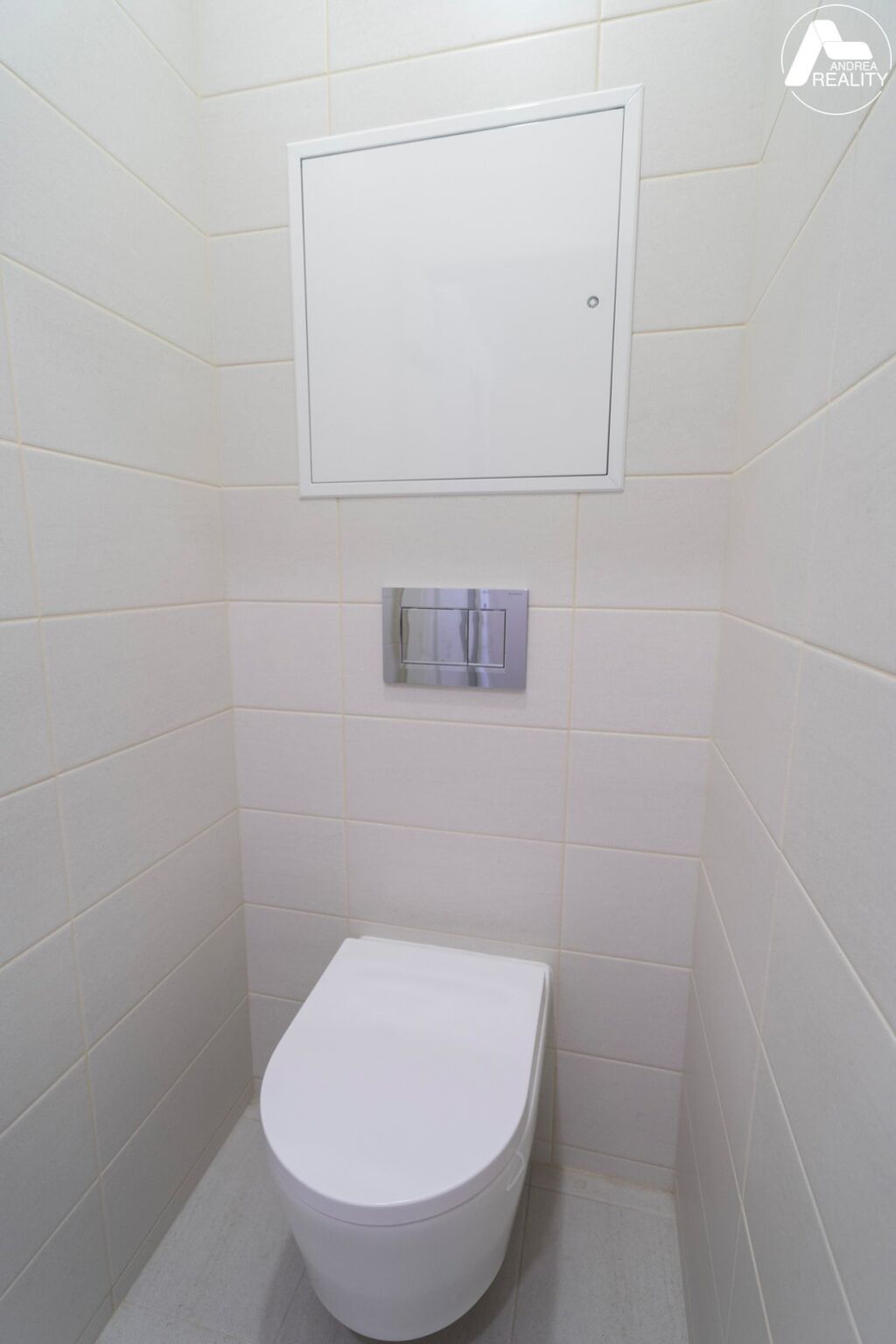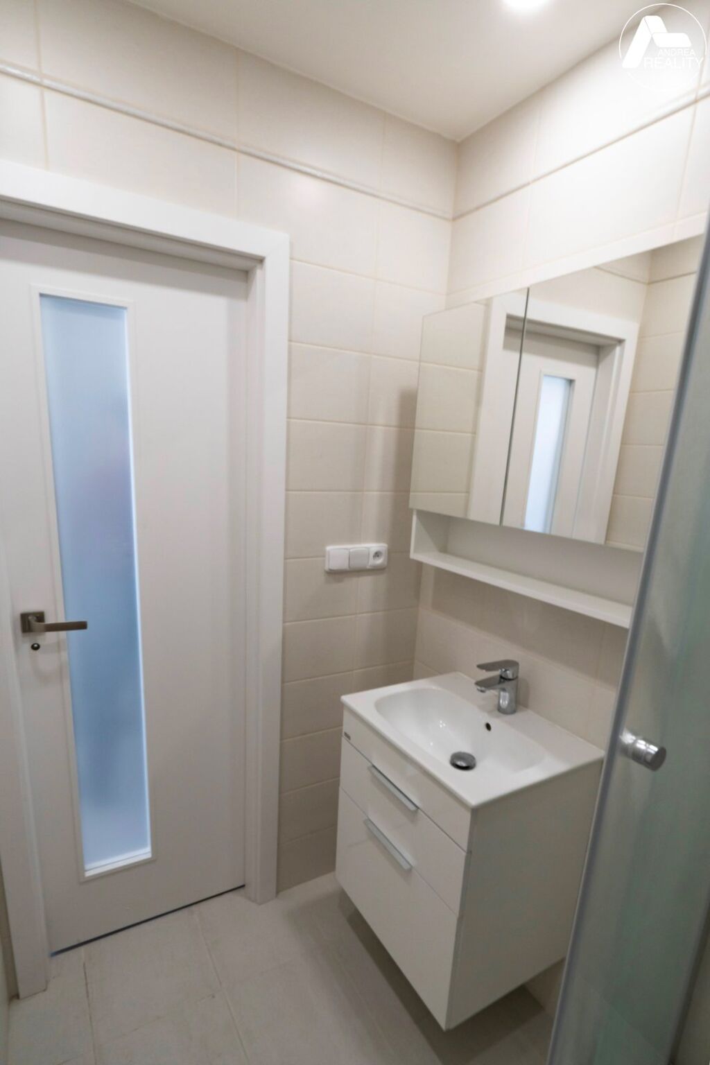 Do bytu vstoupíte přímo do haly (6,7m2) s vestavnou skříní, odkud vedou dveře do ložnice (12,1m2) a zvlášť do obývacího pokoje s kuchyňským koutem (21,00m2). Z haly je též vstup do koupelny (2,1m2) se sprchovým koutem a místem na pračku a na samostatné WC (1,00m2). Obývák je zakončen kuchyňským koutem se zcela novou moderní kuchyňskou linkou a vestavnými spotřebiči včetně myčky, trouby a indukční varné desky.