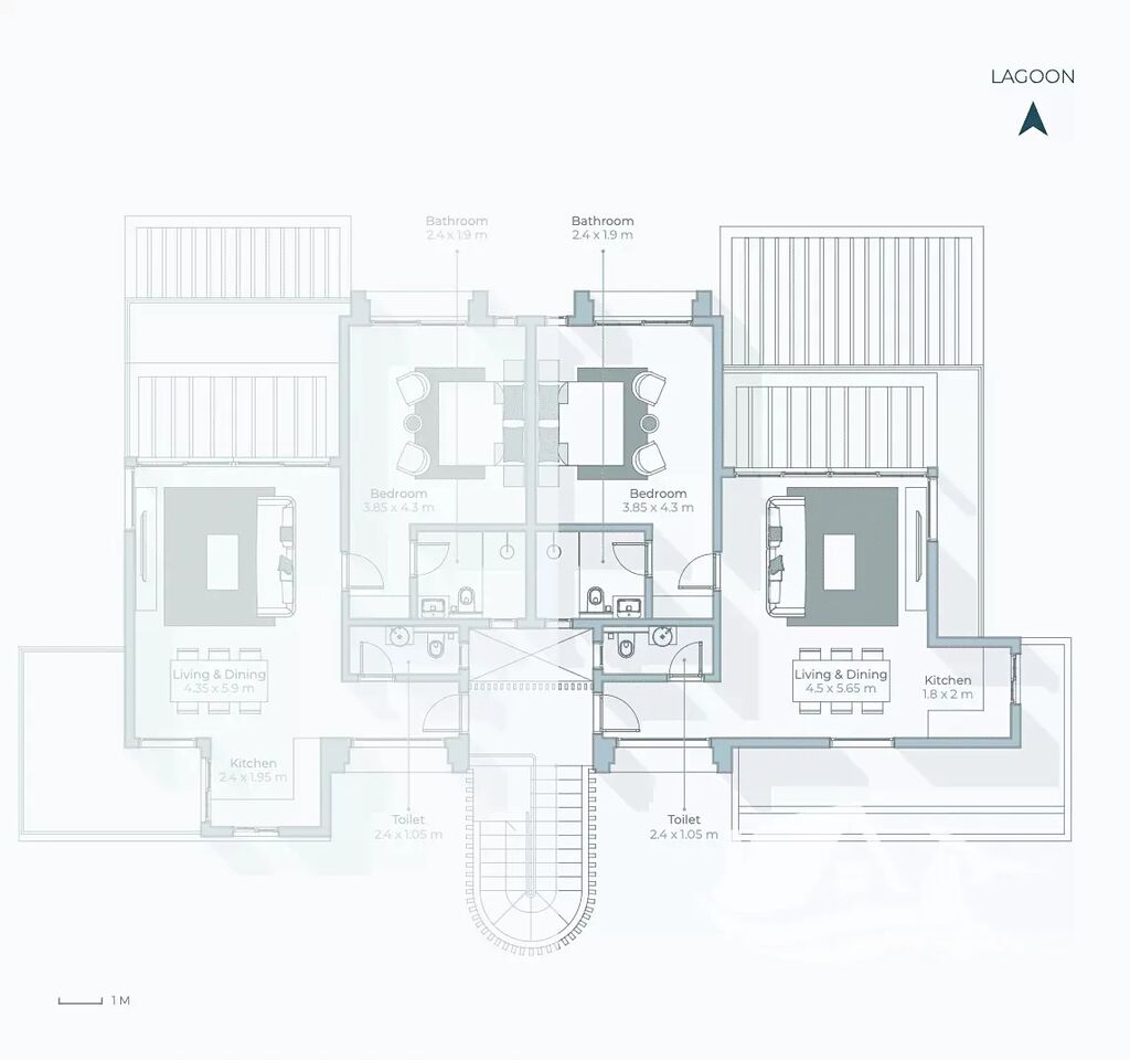 Moderní byt typu B je navržen s důrazem na vzdušnost, eleganci a propojení s okolní přírodou. Otevřený obývací prostor s kuchyní, velkoformátová okna od podlahy ke stropu, přírodní ománský mramor na podlahách a ložnice v butikovém stylu vytváří klidné útočiště plné světla a prostoru.