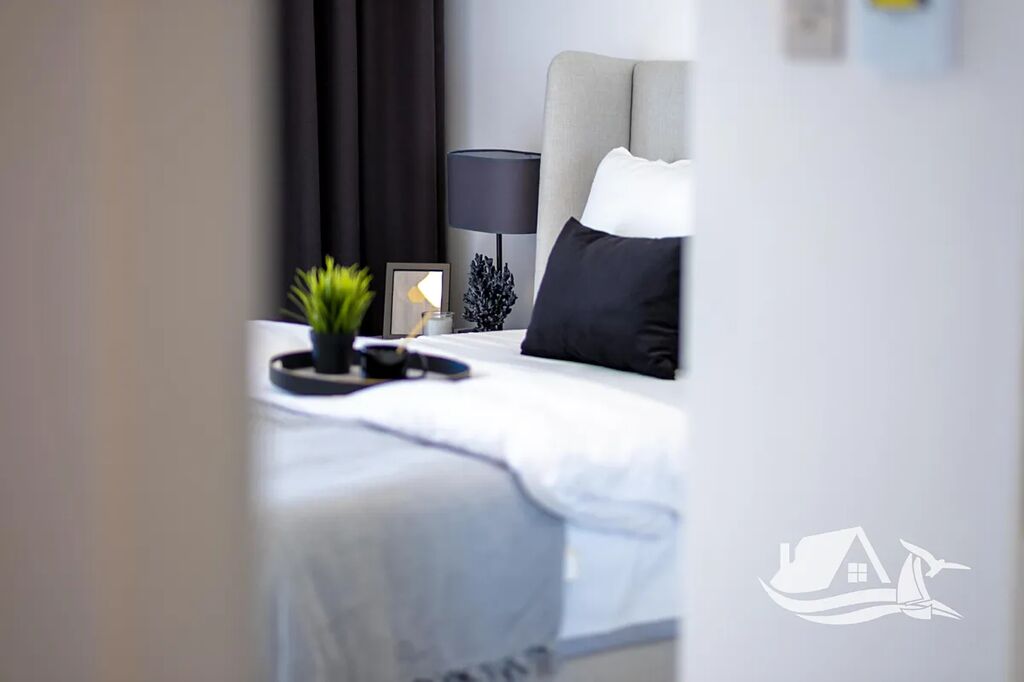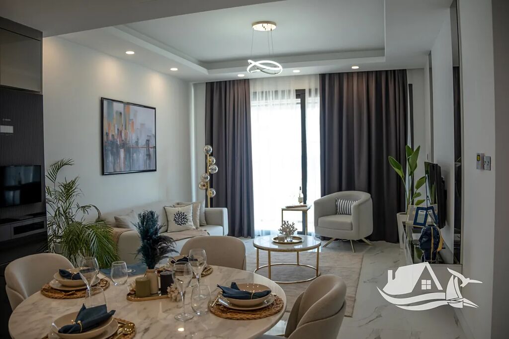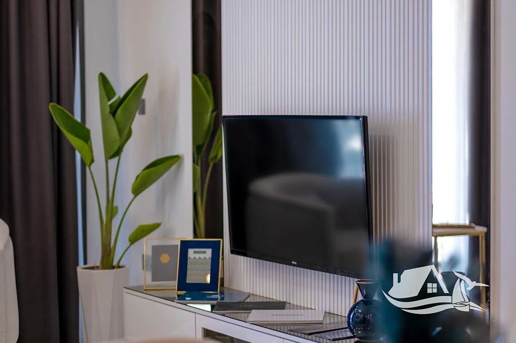 Moderní apartmán 2+kk s balkonem a krásným výhledem na moře a bazén. Nachází se jen pár kroků od pláže, nabízí soukromou pláž, venkovní bazén, fitness,  sky bar a barbecue zónu.