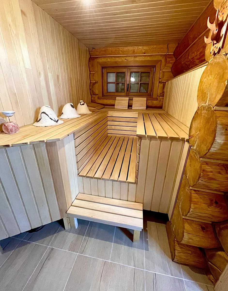 Tento luxusní dvoupodlažní dřevěný srub kombinuje rustikální kouzlo s moderním komfortem. Viditelné dřevěné trámy a sloupy dodávají interiéru jedinečný estetický vzhled a zajišťují vysokou kvalitu celé stavby. Ložnice s balkony v 1.P. poskytují nádherný výhled na okolní přírodu a zajišťují dostatek přirozeného světla a klidu. V obývacím pokoji se nachází stylový krb, který vytápí i celý dům a dodává prostoru útulnost a teplo, ideální pro zimní večery strávené v kruhu rodiny.