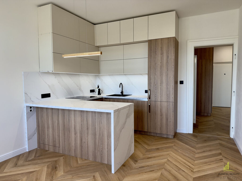 Srdcem bytu je kuchyňský kout s barem, který je vybaven zcela novými spotřebiči, indukční varnou deskou se zabudovaným odsáváním, troubou a myčkou značky Bosch. Dále je v kuchyni vestavěná velká lednice s mrazákem od AEG. Díky systému skříní a polic vyrobených na míru nabízí dostatek úložného prostoru a působí čistým, elegantním dojmem. Každý, kdo rád vaří, určitě ocení podsvícenou pracovní desku s LED páskem, která zpříjemní vaření a dodá kuchyni příjemnou atmosféru.