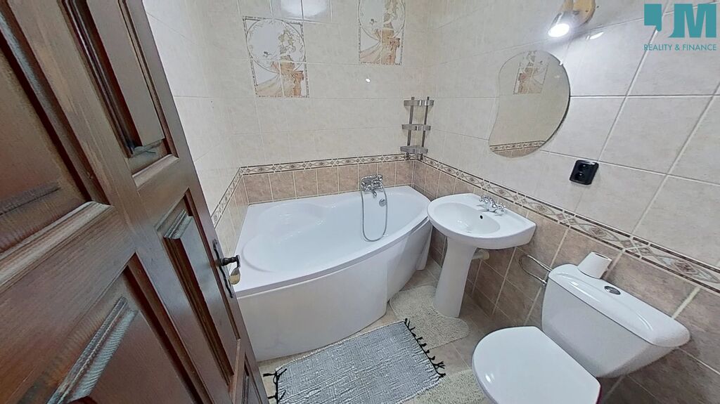 Koupelna je vkusně zařízena, která a disponuje prostornou vanou, umyvadlem, zrcadlem a toaletou.