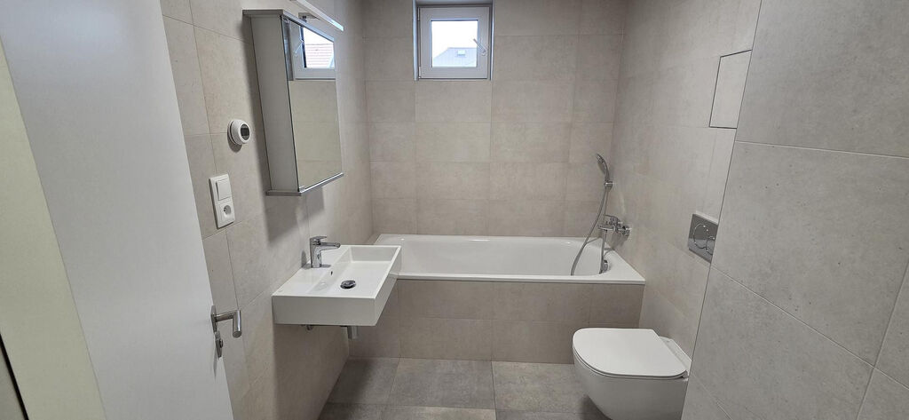 Koupelna je vybavena vanou, toaletou, topným žebříkem a umyvadlem s koupelnovou skříňkou.