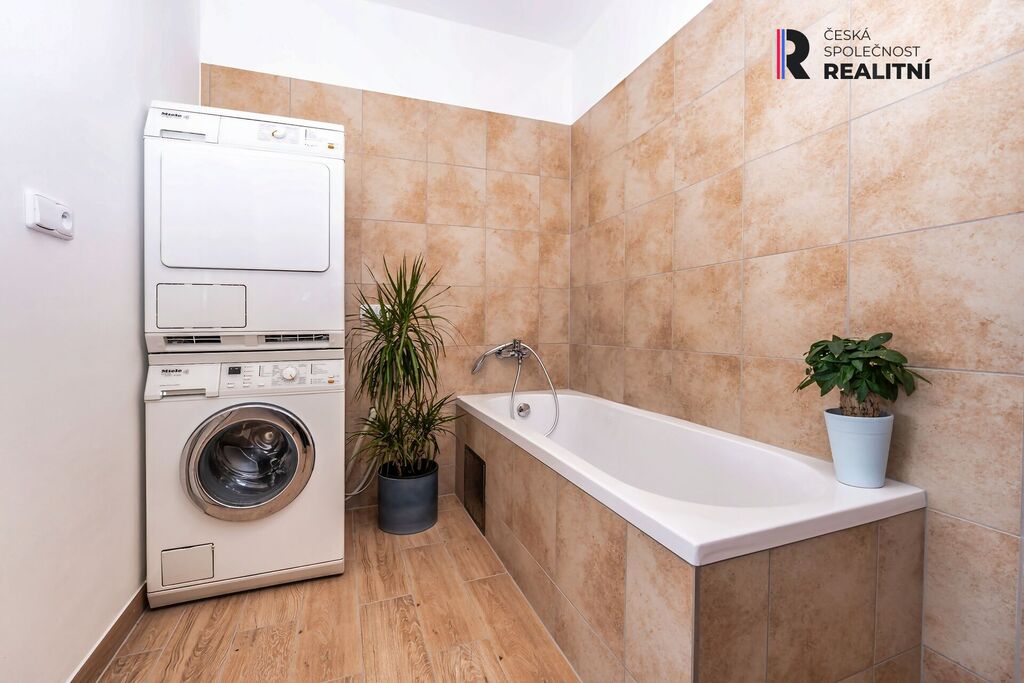 Podlahy tvoří kvalitní vinyl a dlažba.