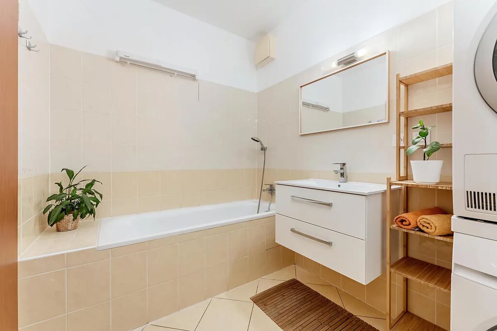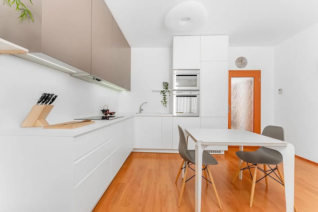 Komfort a styl: Byt se nachází v pečlivě navrženém rezidenčním bytovém domě a je vybaven tak, aby splňoval požadavky současného městského života. Nábytek na míru a vestavěné spotřebiče (myčka, trouba, mikrovlnná trouba, lednice) vám zajistí maximální pohodlí.