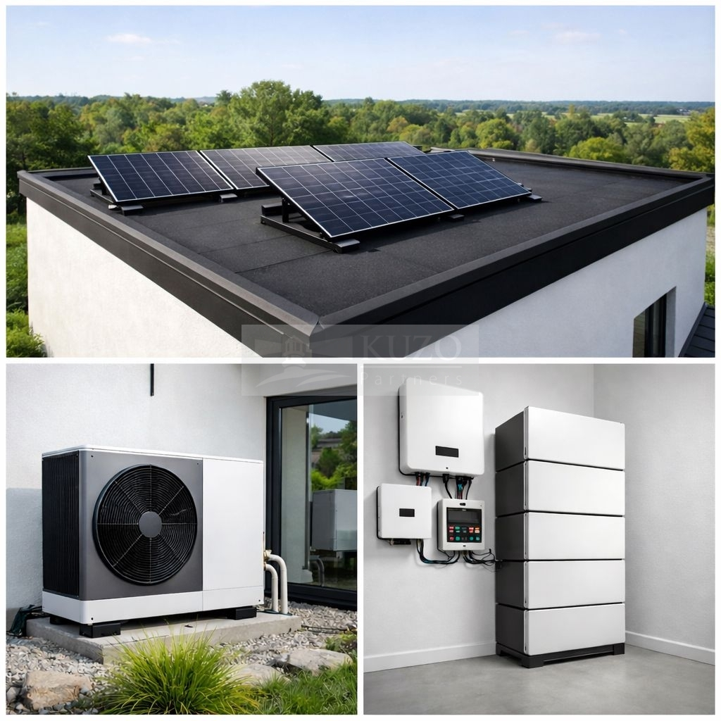 Vytápění domu je řešeno teplovodním podlahovým systémem napojeným na tepelné čerpadlo vzduch–voda, které zároveň zajišťuje ohřev vody. Součástí standardu je také fotovoltaický systém o výkonu 2,5 kW s přípravou pro bateriové úložiště, což dále snižuje provozní náklady. Dům je připraven na instalaci kamerového systému, elektricky ovládané pergoly a disponuje přípravou pro vánoční osvětlení.