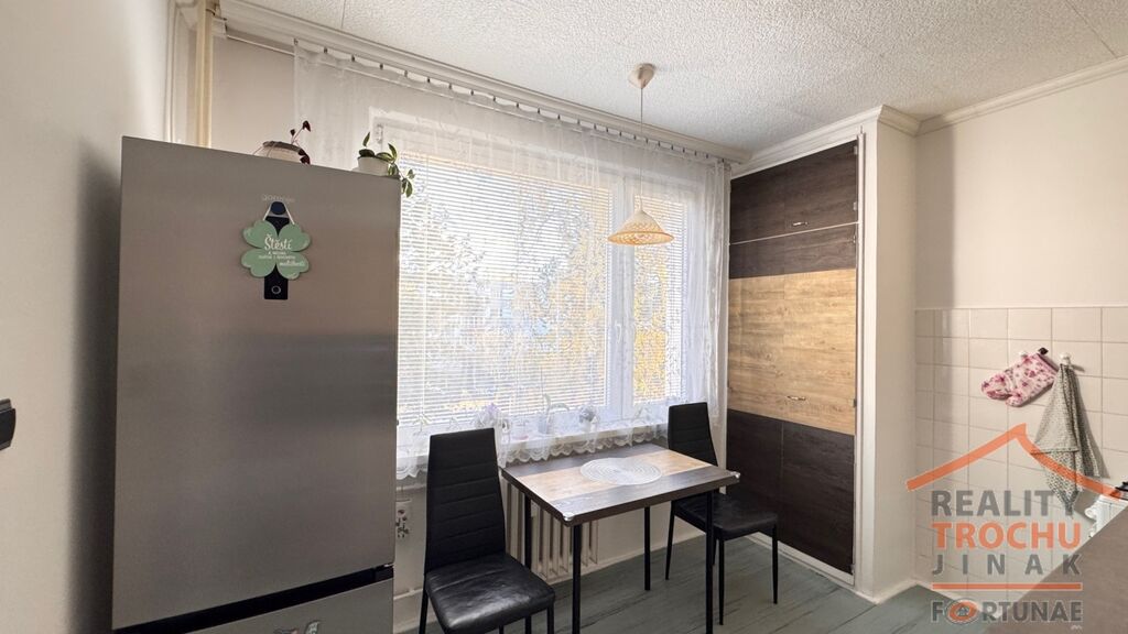 Dispozice: 1 obytná místnost se vstupem na lodžii (3,5 m2), kuchyňský kout s jídelnou, koupelna (vana), samostatné WC, chodba (vestavěné skříně), sklepní kóje.  Topení: ÚT – dálkové.