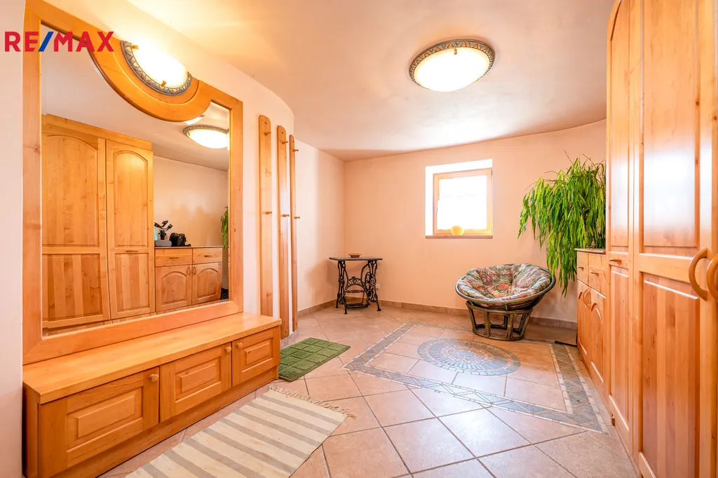 Dispozice domu: obytné podkroví, 1 ložnice,2 hostinské pokoje, 1 dětský pokoj s koupelnou a WC. 1 NP má 2 mimoúrovňové podlahy, kde v mezipatře je ložnice, samostatné WC a koupelna. Obývací pokoj/40m2/ je propojený s jídelnou a kuchyní. Kuchyňská linka je kompletně osazena značkovými spotřebiči. Je zde samostatná spižírna. V přízemí je hlavní vstup do domu s halou a chodbou vedoucí na zahradu. Z chodby je samostatný vstup do prádelny, kotelny se zásobárnou dřeva a technické zázemí - 1x garáž pro osobní auto, propojená s velkou garáží pro SUV nebo dodávkový automobil. Z garáže je samostatný vstup do dílny a podzemního kamenného sklepa.