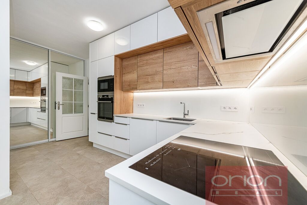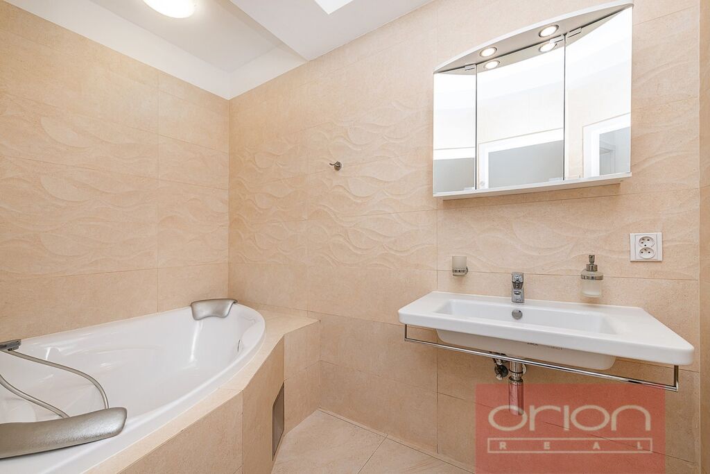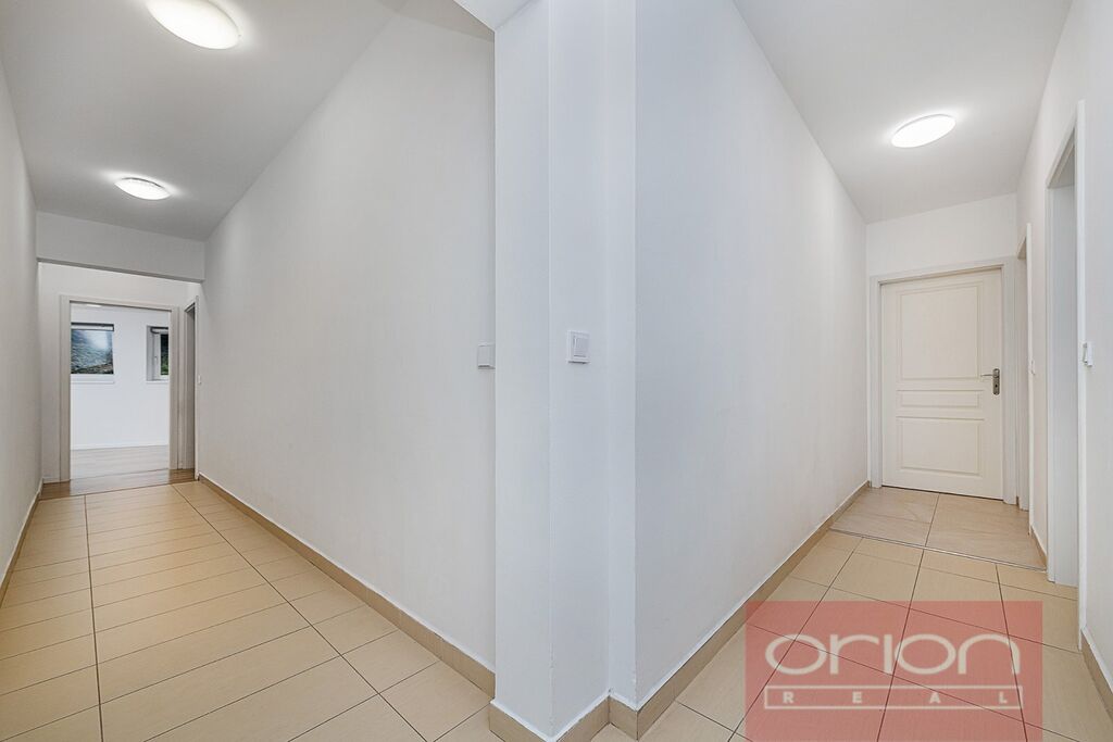 Dispozice bytu nabízí zádveří, prostornou chodbu s vestavěnými skříněmi, samostatnou kuchyň s moderní kuchyňskou linkou s pracovní deskou Dekton a všemi kuchyňskými spotřebiči zn. AEG, 5 samostatných pokojů, 1 koupelnu se sprchovým koutem a toaletou, 1 koupelnu s vanou, 2 samostatné toalety a technickou místnost s vestavěným policovým systémem, pračkou a sušičkou. Ve dvou ložnicích jsou vestavěné skříně a nábytek, podlahy jsou kvalitní vinylové. Vytápění je zajištěno plynovou kotelnou v domě.