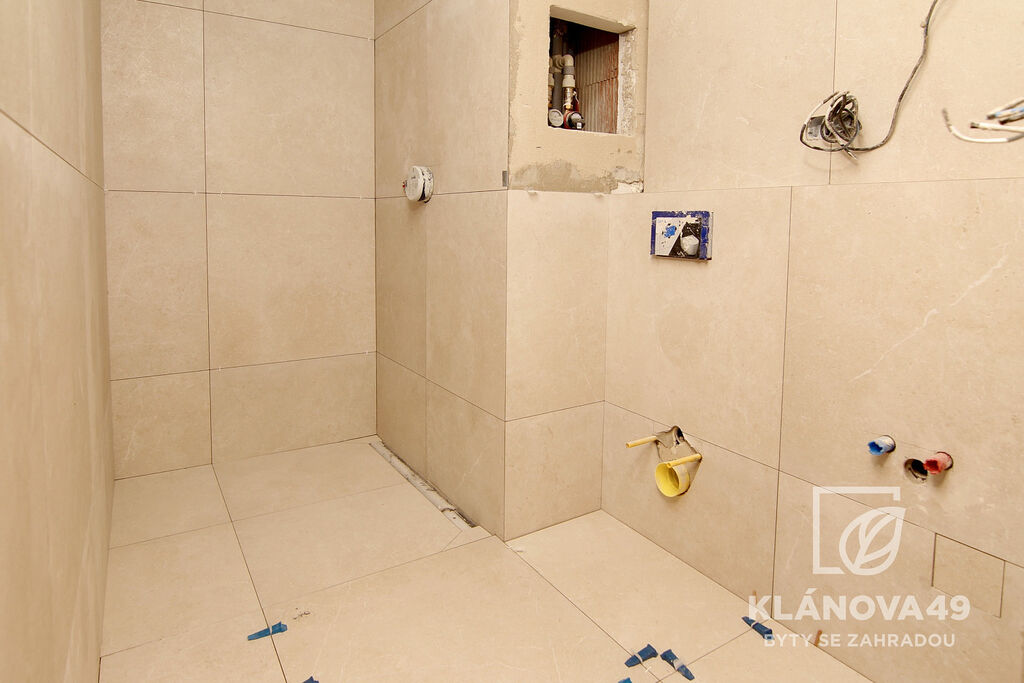 Tento konkrétní byt 4+kk má orientaci na severní stranu do zahrad, mimo silnici. Z výstavby je dokončena hrubá stavba, jsou instalována okna a pokračují práce na instalacích uvnitř domu.