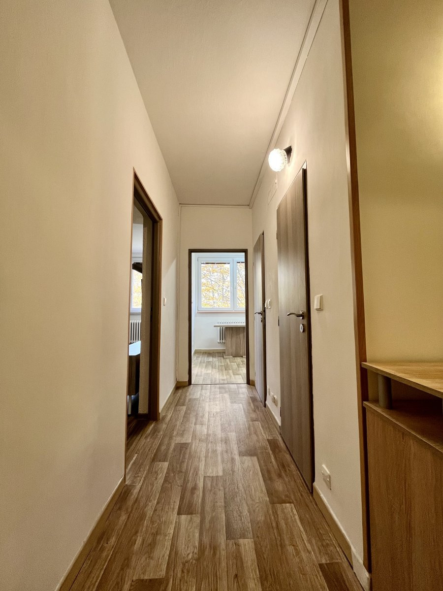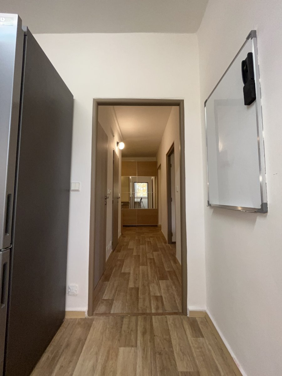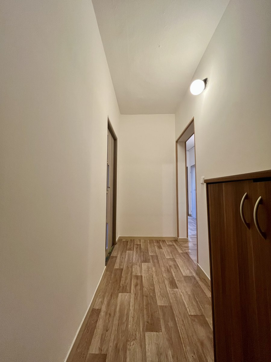 Byt je částečně vybavený a má skvělou dispozici – z prostorné předsíně s vestavěnými skříněmi se vchází do všech místností: