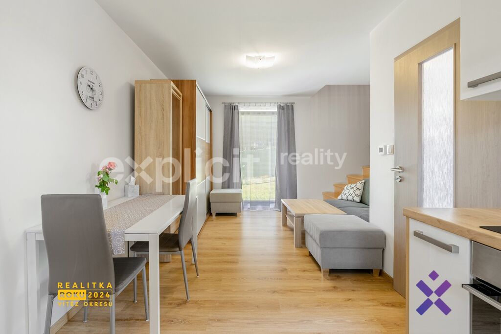 Dům má dvě plnohodnotná nadzemní podlaží. V přízemí hlavní části domu (5+kk) se nachází prostorný obývací pokoj s kuchyňským koutem a přímým vstupem na zahradu, dále pak technická místnost, koupelna a samostatný pokoj vhodný jako pracovna či ložnice. V podkroví se nachází celkem tři pokoje, koupelna a praktická komora.