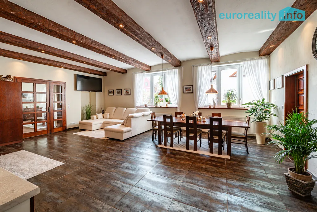 Nabízíme k prodeji exkluzivní rodinný dům s ateliérem/dílnou a garáží, situovaný v malebné oblasti Chodové Plané, v okrese Tachov. Tento samostatný přízemní objekt je ideální volbou pro ty, kteří hledají spojení komfortu s přírodou v harmonickém prostředí. Dům o zastavěné ploše 462 m² a užitné ploše 274 m² je v velmi dobrém stavu a nachází se na parcele o rozloze 627 m². Interiér je po moderní a velmi elegantní rekonstrukci s důrazem na kvalitu a detail. Vybavení nemovitosti je částečné, což umožňuje dalšímu uživatelskému rozvoji. Atmosféra domu s velkorysými a prosvětlenými prostory, podtrhuje pocit prostornosti, který si budete užívat. Tento dům disponuje dvěma samostatnými byty 166 m2 a 71 m2, atelierem/dílnou 71 m2 s vlastním zázemím, garáží 49 m2 a dvěma parkovacími místy, což zaručuje dostatek prostoru pro vozidla a další potřeby. Moderní technické vybavení zahrnuje připojení na vodovod, kanalizaci i plyn. Teplo je zajišťováno kotlem na tuhá paliva, zatímco teplou vodu dodává elektrobojler. Úvodní fotografie obsahují vizualizaci nové fasády, na kterou se již sjednává dotace.