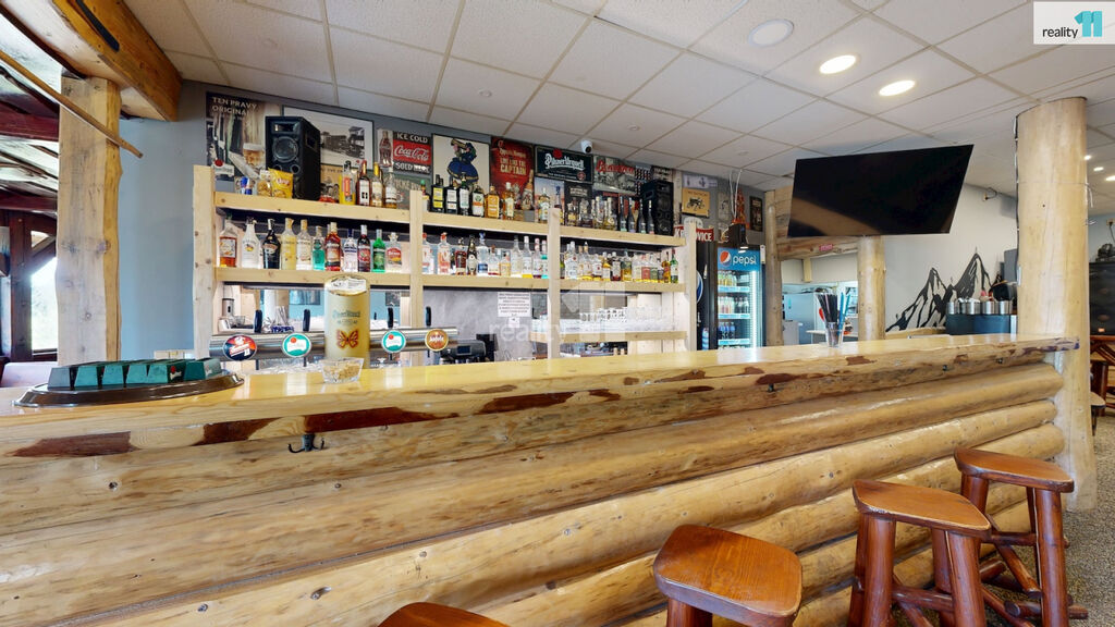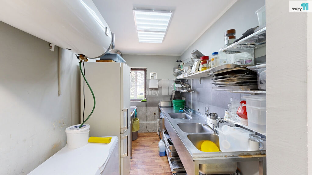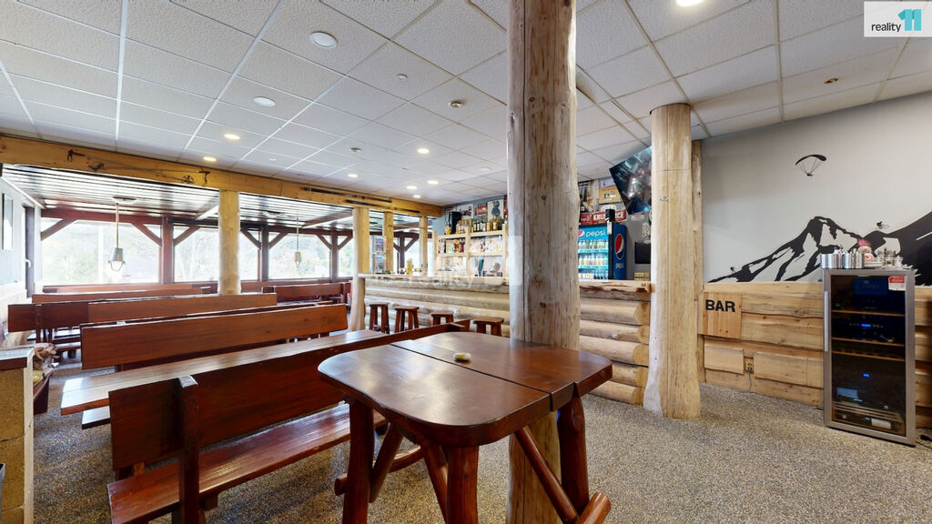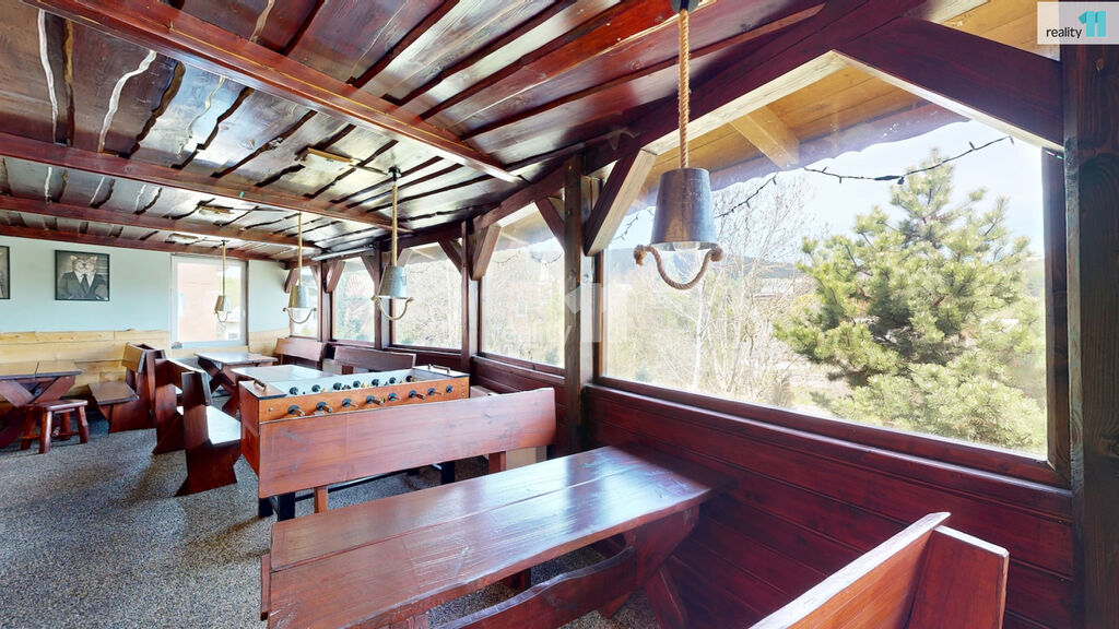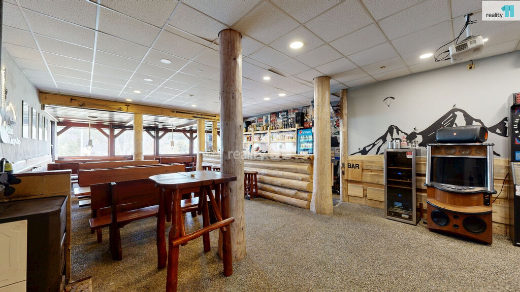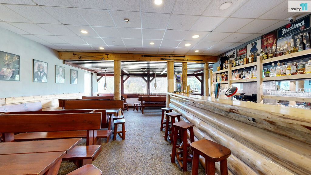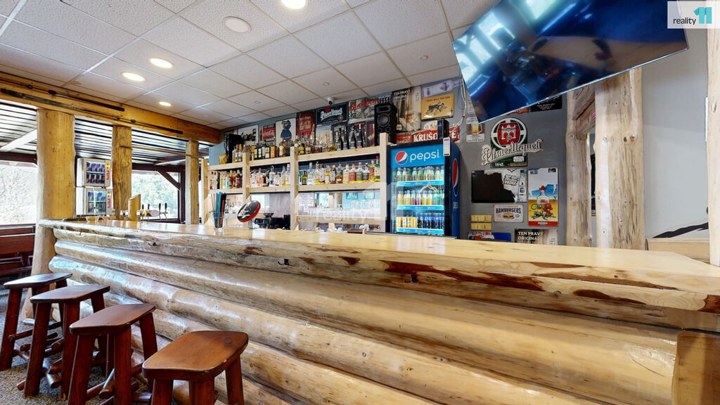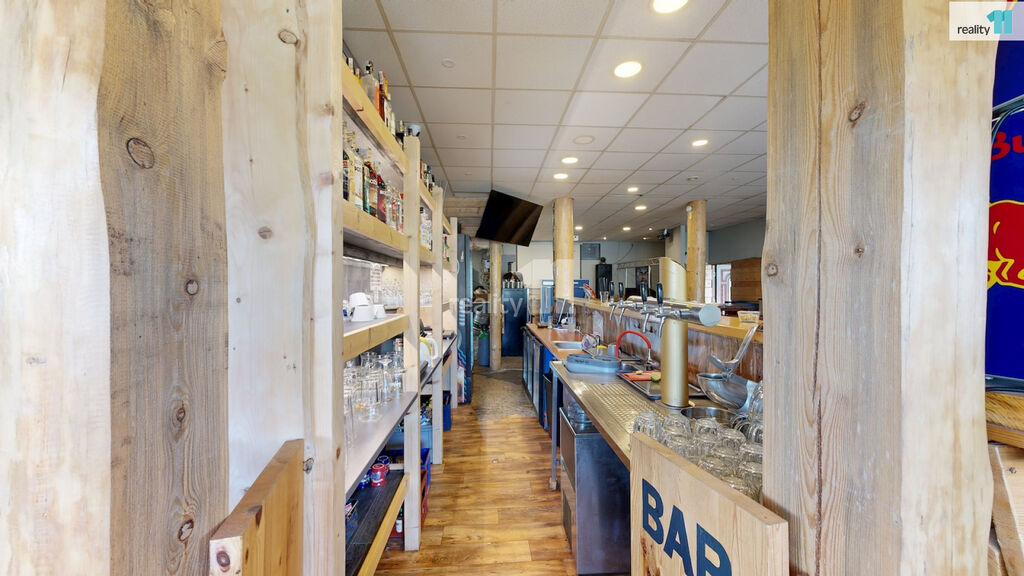 Jedná se o bývalou budovu jednoty, okálového typu, kde došlo k částečnému prosklení a byla přistavěna velká terasa. Hlavním vstupem se dostaneme do zádveří s technickou místností a skladem, dále pak do hlavního sálu s krásným dřevěným barem, masivními stoly, a částí, která slouží jako parket, případně pro turnaje v šipkách, projekce atd. V zadní části je pak sociální zázemí, kuchyně (vybavení kuchyně je možné odkoupit od současného nájemce), několik skladů a dalších technických místností.