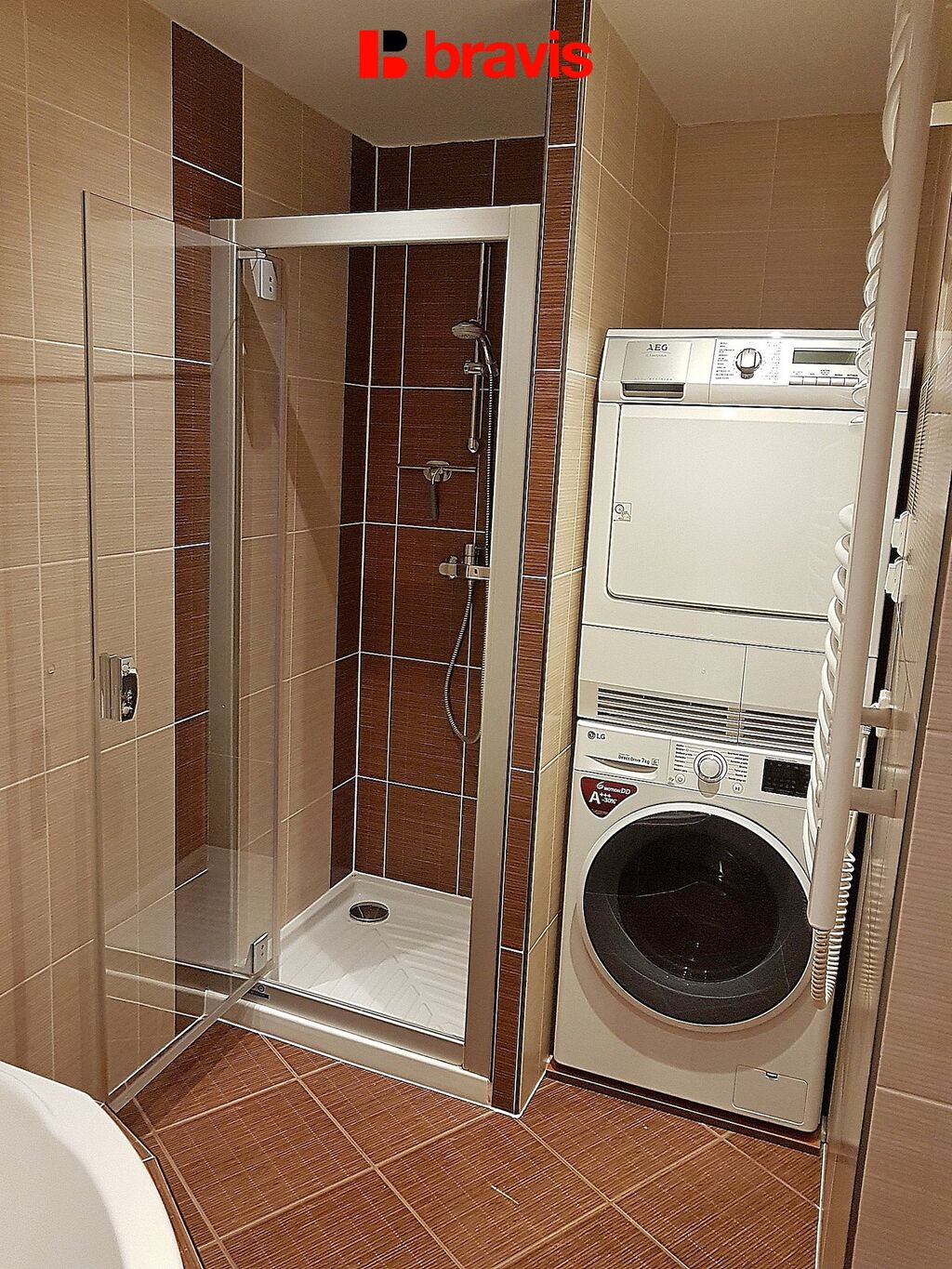 Prostorná zděná koupelna s vanou, sprchovým koutem, pračkou a sušičkou