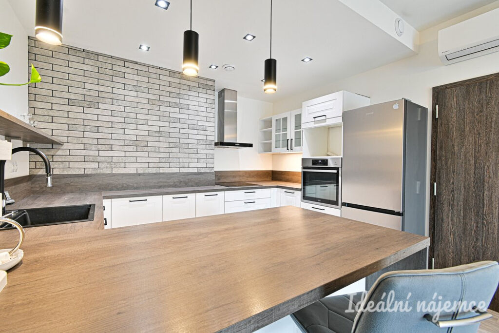 Byt se nabízí vybavený dle fotografií. Kuchyně disponuje krásnou kuchyňskou linkou s veškerými spotřebiči - varnou deskou, elektrickou troubou, lednicí s mrazákem, myčkou, digestoří, úložnými prostory, barovým pultem a židlemi. V obývací části je k dispozici gauč, TV stolek a Televize. Ložnice je vybavena šatní skříní, manželskou postelí a nočními stolky. Moderní koupelna se sprchou, umyvadlem, pračkou a toaletou.