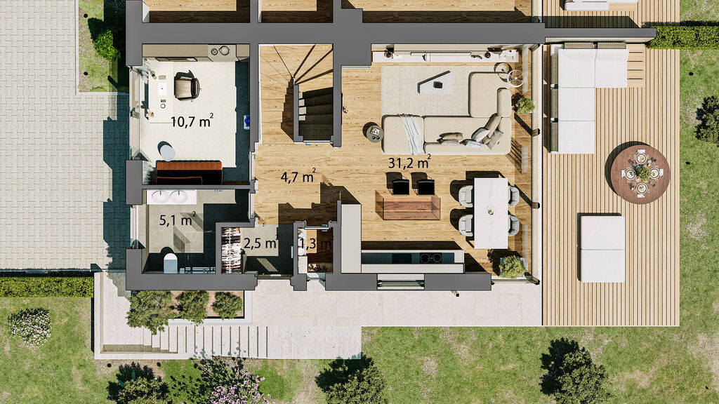 • Prostorný obývací pokoj s kuchyní (31 m²) propojený prosklenou stěnou po celé délce na terasou a zahradou