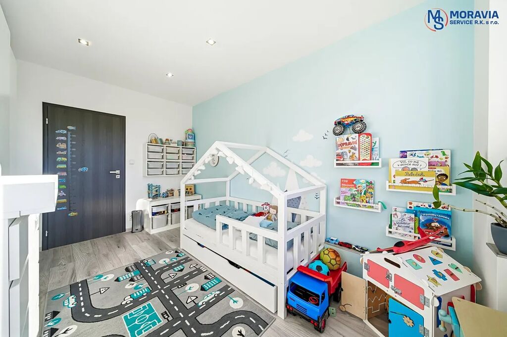 Dispozice: Ložnice, dětský pokoj a prostorný obývací pokoj poskytují dostatek místa pro rodinný život.
