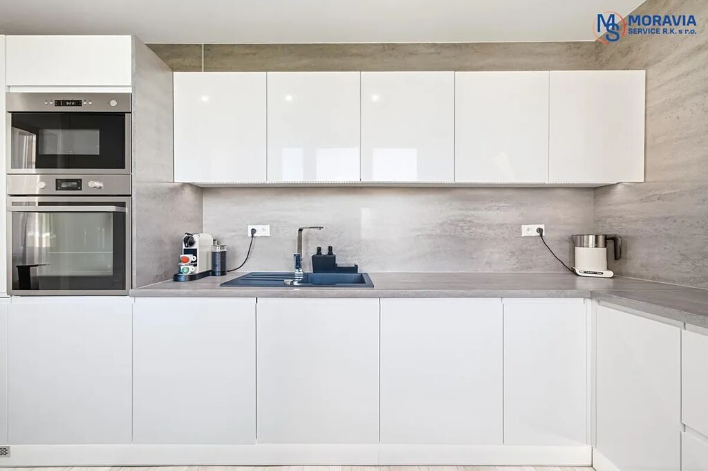 Moderní kuchyně : Nově vybavená s dostatkem úložného prostoru.